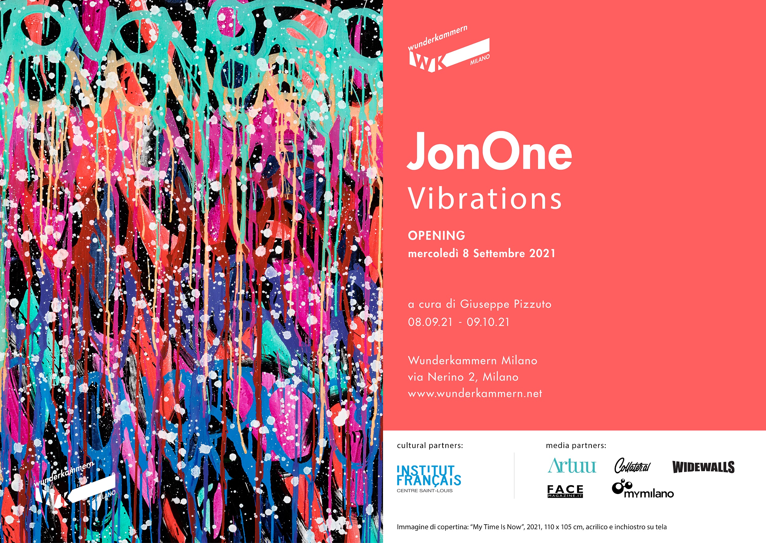 Dopo la mostra personale Niente Può Fermarmi a Palazzo Velli (Roma, 2018) JonOne torna in Italia. Presso la sede milanese della Galleria Wunderkammern (via Nerino 2) esplode dall’8 settembre (artista presente all’inaugurazione serale) l’energia delle tele inedite realizzate dall’artista di fama mondiale appositamente per la mostra Vibrations.