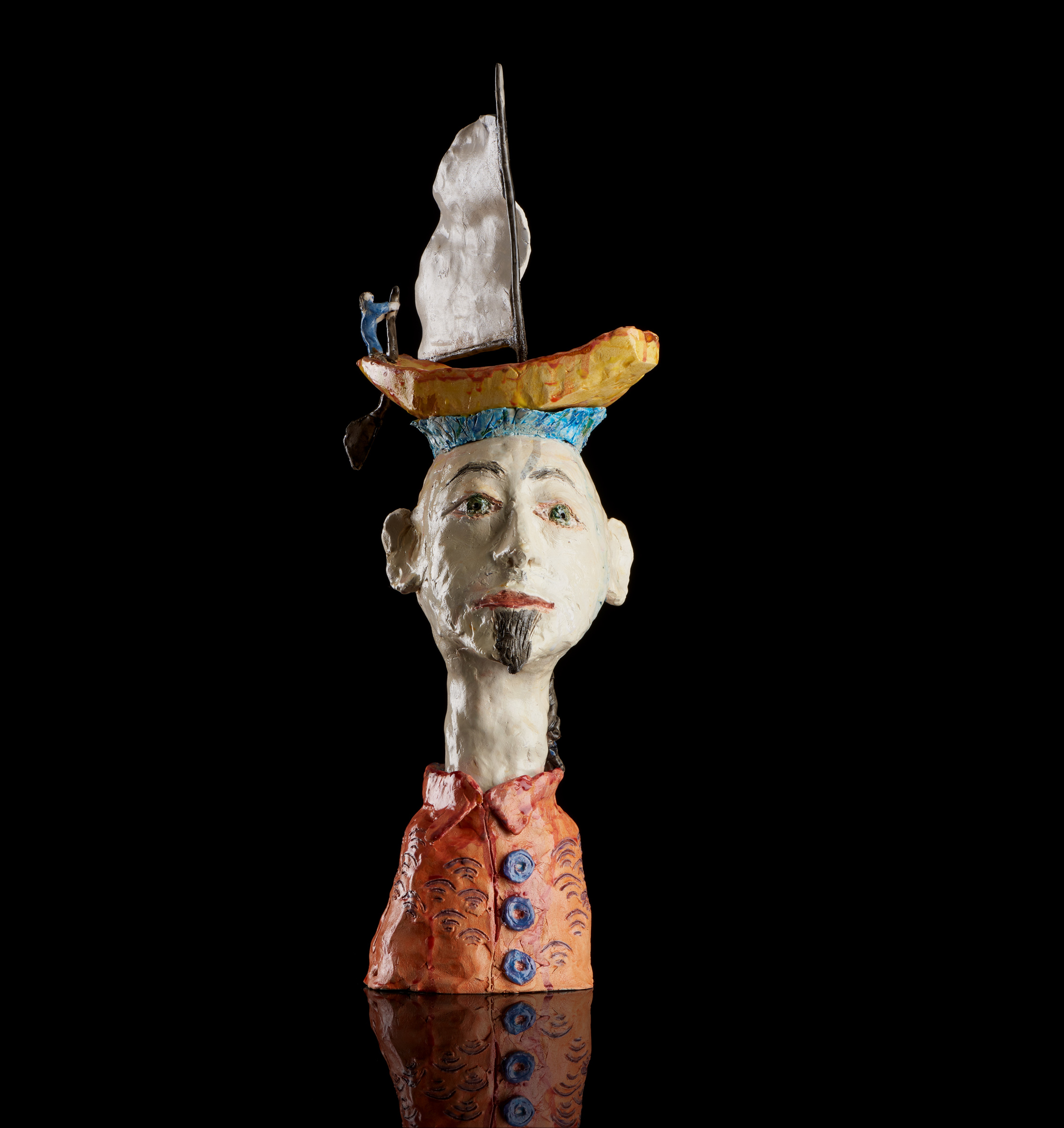 Per Ovidio stesso la sua poesia sembra essere stata un mezzo per trovare la risposta a una domanda: dietro tutte le manifestazioni, cosa potrà essere duraturo? – una domanda affrontata anche da questa mostra, così come la domanda sull’ambiguità e sulle manifestazioni mutevoli. Tale tematica viene trattata già nell’opera principale di questa raccolta; argilla morbida, liscia viene modellata in sculture meravigliose e attraverso diversi processi di cottura trasformata in storie variopinte, dure come il vetro. Klein-Josef, seduto sul bordo di complessivamente 23 palcoscenici a forma di piatto, sta ammirando opere di famosi artisti. Opere che in qualche maniera hanno toccato l’evoluzione di Josef Rainer, influenzando e forse anche cambiando così la sua produzione. Tre busti si riallacciano a questo tentativo di una breve storia della civiltà. In due busti di ceramica vengono interpretate opere classiche della letteratura. Il barone rampante di Italo Calvino e Le tribolazioni di un cinese in Cina di Jules Verne. Il barone sembra concresciuto con un tronco d’albero, un accenno al suo eremitaggio autoimposto in una chioma d’albero. Al posto di un copricapo, ad adornare la testa del cinese è una scena fluviale con giunca, un riferimento a una scena chiave del libro. Il terzo busto, questa volta un ritratto doppio di gesso che gira, muta in modo bifronte dall’immagine di uno scimpanzé in quella di Charles Darwin. In questa opera lo scienziato dell’evoluzione Darwin è legato inseparabilmente al suo oggetto di ricerca. Una serie di dipinti tratta il motivo dell’uomo-scimmia e lo approfondisce. Scimmie che sfogliano e leggono libri della letteratura universale. Queste scimmie leggenti non sembrano molto umane? La ragione di ciò sta unicamente nell’atto del leggere? La tematica dell’animale-uomo persiste nel principe ranocchio di ceramica. Sembra che il ranocchio che rivendica il proprio diritto sia stato sbattuto sulla parete dalla principessa giusto in quel momento, ancora tutto in forma di ranocchio. Ma forse un istante dopo già un bellissimo principe.