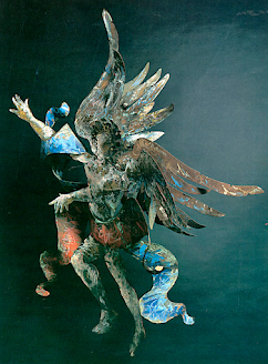 Instancabile fabbricante di storie, è un artista naturalmente proiettato in una dimensione teatrale eppure mai “spettacolare”. Il suo immaginario attinge alla storia, al mito e all’epopea, ma la sua tecnica recupera l’arte povera, riuscendo ad infondere energia dinamica e portando a nuova vita imballaggi, legno, ferro altrimenti destinati al macero. Sotto il suo tocco il cartone vibra, il legno respira, la carta si infiamma e la scena diventa azione, congegno meccanico, marchingegno dadaista che tuttavia gira, rotea, scricchiola, in una parola funziona.
