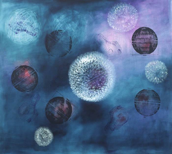 La forza della fantasia e della sperimentazione vengono altresì sottolineati dall’utilizzo di sapienti tecniche artistiche; accanto alle più tradizionali, ma sempre straordinarie opere olio su tela come “Cosmic Snowballs”(immagine della locandina) e “Cosmic connections II e III”, l’artista assembla vetri di Murano, collages e resine su tavola, come è possibile ammirare nelle recentissime “Moonlights becomes you” e “Hotel Universe”.
