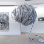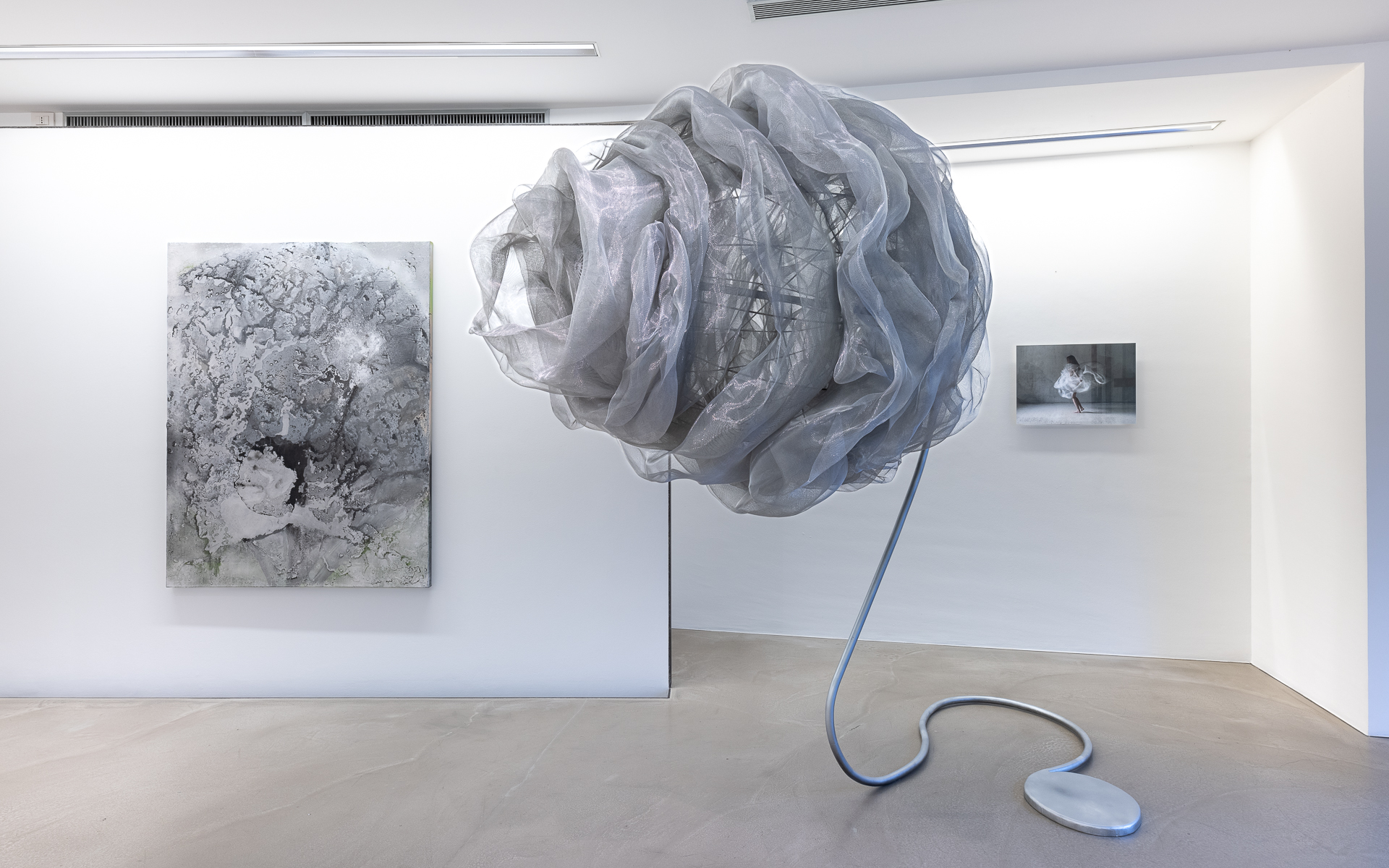 Con questo ciclo di opere inedite, Julia Bornefeld (Kiel,1963) tende a creare un imperscrutabile ordine nel caos dei cambiamenti attraverso opere realizzate impiegando materiali e tecniche diverse che stupiscono lo spettatore. Ci troviamo di fronte a sculture che coniugano la leggerezza di un tessuto in rete di alluminio con strutture in acciaio per dare vita a forme universali che dialogano con le opere allestite a parete. La mutevolezza del cosmo prende forma sulle tele ed assume tutti i toni dell’argento per dare vita agli eventi che gli appartengono. Alla ricerca di un equilibrio e di un’apparente quiete corrisponde invece la serie di fotografie su diaplex; l’artista mette in scena una giovane danzatrice che indossa un costume “rubato” alle sue sculture.