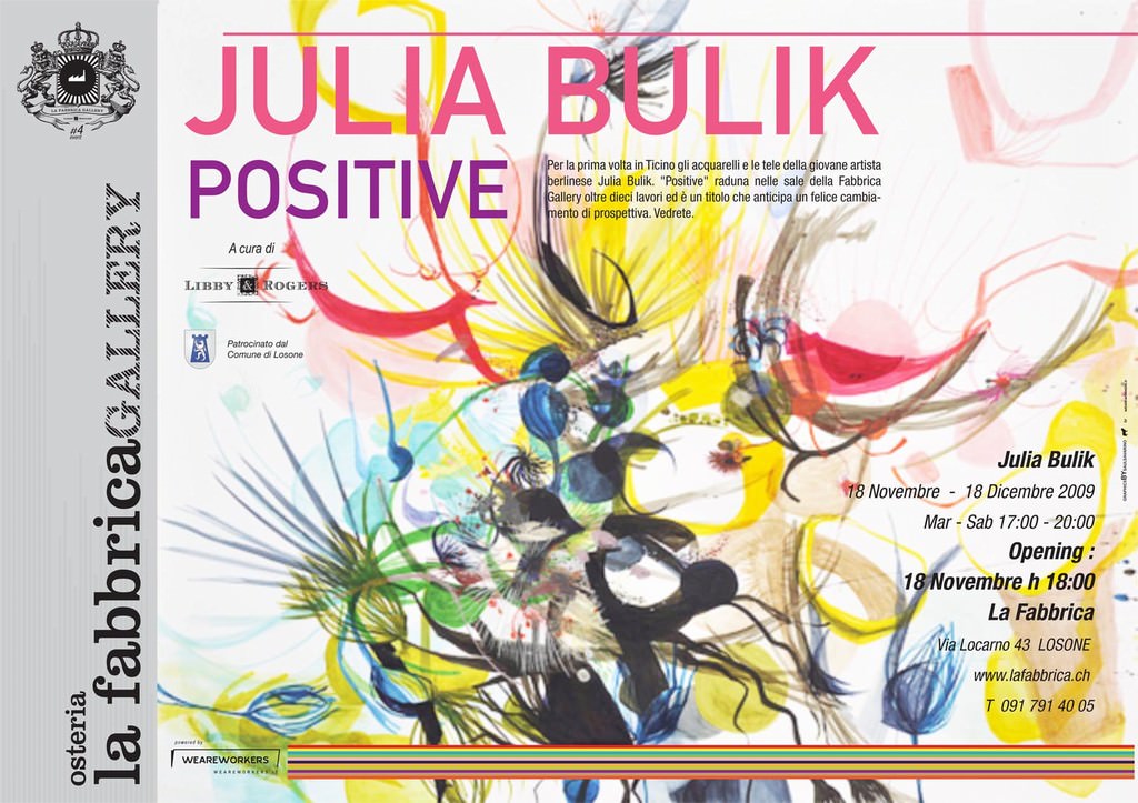 Prima in Ticino dell’artista Julia Bulik, neodiplomata presso la Kunsthochschule di Berlino Weissensee. La mostra propone una selezione di opere, acquarelli e tele, della giovane artista berlinese. “Positive” è un titolo che anticipa un felice cambiamento di prospettiva. Vedrete.