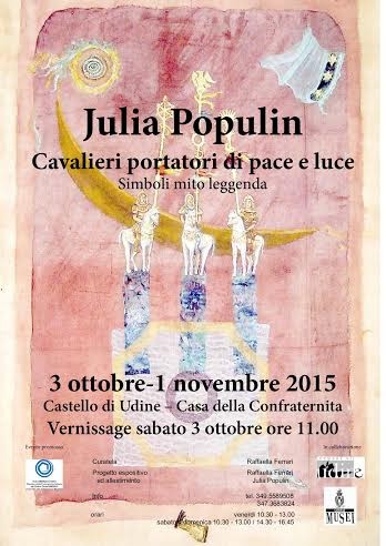 In data 3 ottobre 2015 alle ore 11.00 sarà inaugurata, presso la Casa della Confraternita – Castello di Udine, la mostra personale dell’Artista Julia Populin: “Cavalieri portatori di pace e luce. Simboli, mito, leggenda”. La mostra è promossa dal Club Unesco di Udine in collaborazione con il Comune di Udine e i Civici Musei e curata dal critico d’arte Raffaella Ferrari. La mostra sarà aperta al pubblico dal 3 ottobre 2015 al 1 novembre 2015 durante i fine settimana con i seguenti orari: venerdi 10.30-13.00, sabato e domenica 10.30-13.00 / 14.30-16.45.
