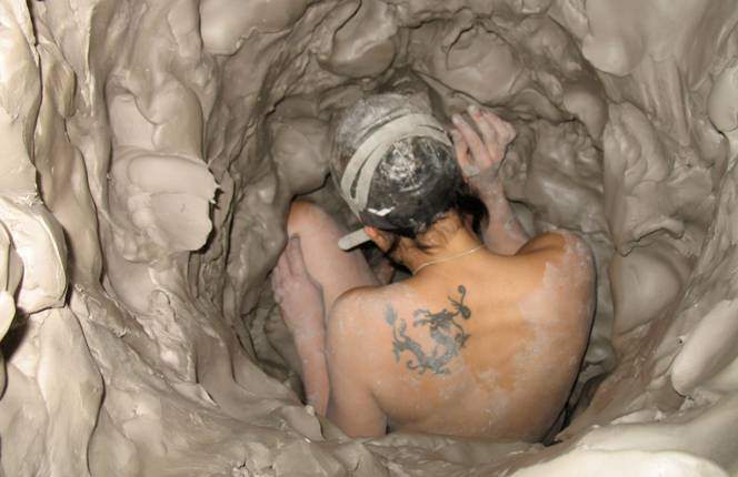 The body is both the creator and subject of Juliana Cerqueira-Leite’s work. This Brazilian-American artist begins each sculpture or canvas by literally throwing herself into it – burrowing through huge blocks of clay, pouring plaster repeatedly over her body, and manipulating her paint-covered body over canvas panels. This very physical process leaves traces of the motion, dimensions, physical limitations and extremities of her body, and from these beginnings she makes her drawings, and her sculptures with metal, latex, wood and plaster.