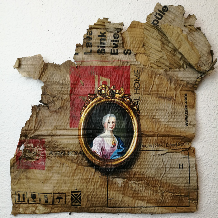 Presso la galleria Tales Of Art saranno esposte fotografie degli interventi in luoghi pubblici di Cabanding, affiancate da un intervento pittorico dell’artista su un muro interno della galleria e da una serie di opere create esclusivamente per questa mostra: riproduzioni di lavori iconici dei maestri della pittura, come Van Gogh, Monet, Friedrich ed altri, dipinti su vecchie scatole di cartone che diventano il supporto non-tradizionale prediletto dall’artista. Inoltre, in relazione al patrimonio artistico della città, l’artista ha realizzato le riproduzioni di due quadri presenti al Museo di San Domenico: una natura morta seicentesca di Francesco Codino e il Ritratto di donna, piccolo e grazioso dipinto settecentesco che l’anno scorso venne rubato dai Musei, ma grazie all’Arma dei Carabinieri fortunatamente ritrovato e restituito al Museo.