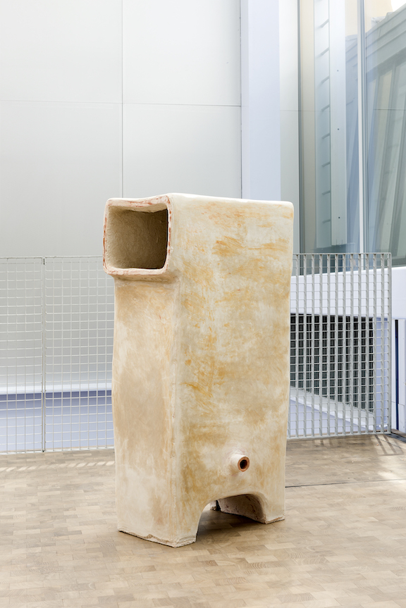 Nella prima stanza, sculture di forma cubica sono esposte come frammenti museologici rimossi dal loro contesto architettonico: opere in ceramica che si ispirano alla “khabya”, un elemento tipico, ormai obsoleto, delle case rurali levantine. Prima dell’avvento della refrigerazione, queste camere climatiche erano usate per conservare i grani per il consumo annuale; esagerando le sporgenze e le aperture di queste forme, le opere di Jumana Manna assumono una qualità antropomorfica e una scala più vicina al corpo umano.