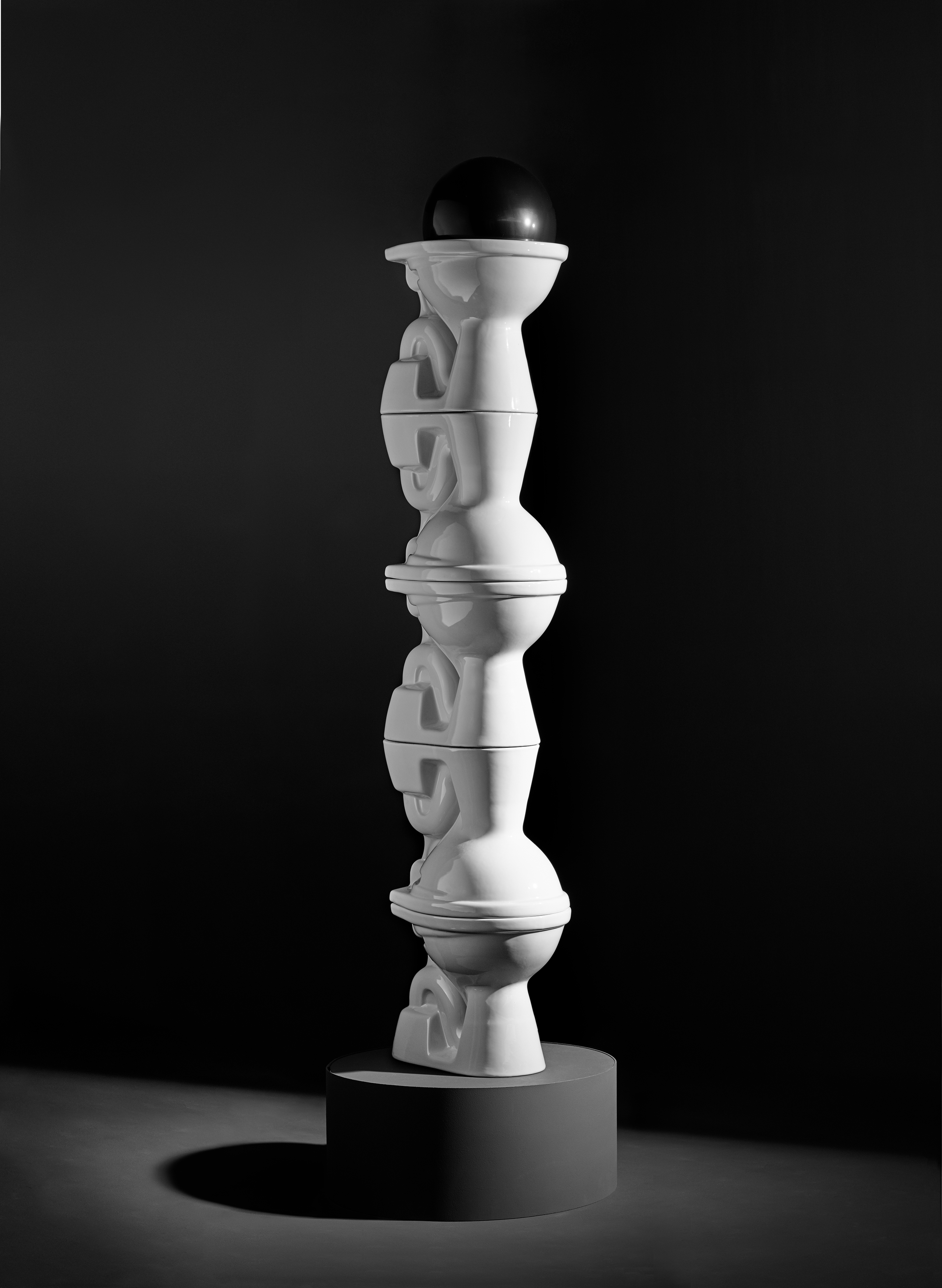 Con la serie B (Brancusi Block), del 2017, Klauke richiama invece la questione dei confini tra vita e arte, che le avanguardie classiche cercavano di dissolvere. Citando forme e motivi dell'avanguardia, la voce dell'arte critica, in quest'opera le tazze da bagno sono in equilibrio l'una sull'altra, formando un’ incantevole colonna. Nelle immagini meticolosamente composte, le superfici bianche e lisce risplendono con una luce perfetta sullo sfondo nero. Le stampe di grandi dimensioni conferiscono una dimensione scultorea alle fotografie, che - nonostante la sua assenza all'interno dell'immagine - attingono al corpo come punto di riferimento. Inevitabilmente, questo richiamo riporta l'attenzione sulla qualità mondana degli oggetti che devono alla profanità dell'esistenza umana. Il banale e il sublime non si fondono. L'arte e la vita non formano un continuum, ma le opere di Klauke propongono un'estetica dell'estrazione e dell'interruzione.