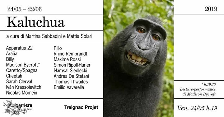 Kaluchua Apparatus 22, Araña, Billy, Madison Bycroft, Caretto / Spagna, Cheetah, Sarah Clerval, Ivan Krassoievitch, Nicolas Momein, Pillo, Rhino Rembrandt, Maxime Rossi, Simon Ripoll-Hurier, Jojo, Namsal Siedlecki, Andrea De Stefani, Thomas Thwaites, Emilio Vavarella a cura di Martina Sabbadini e Mattia Von Solari 24/05 — 22/06 2019 Venerdì 24/05 H.19 H.19.30 Lecture-performance di Madison Bycroft coordinato da Sergey Kantsedal stagista: Yuliya Say Barriera Host ︱Please, scroll down for English︱ Barriera inaugura Kaluchua, una mostra collettiva che celebra il potenziale artistico animale. Il progetto è il risultato di una residenza che ha avuto luogo a Treignac Project (Treignac, Francia) nell’estate 2018, e presenta i lavori creati in cooperazione tra artisti di diverse specie. Il titolo della mostra deriva dal neologismo “kaluchua” introdotto dal primatologo giapponese Kinji Imanishi negli anni cinquanta per descrivere alcuni aspetti sociali nei comportamenti dei macachi (Macaca Fuscata). La parola “kaluchua” deriva, infatti, dalla storpiatura della parola inglese “culture”, concetto che Imanishi differenzia dal corrispettivo giapponese “bunka”, per enfatizzare il fenomeno della trasmissione del sapere attraverso l’insegnamento (e non attraverso l’istinto o i geni) da altri aspetti della cultura. Al di là del concetto di “kaluchua”, ci si potrebbe chiedere quali siano i regimi di trasmissione del sapere, i modi di collaborazione e comunicazione tra specie compagne. Questo progetto intesse una rete d’incontri, alleanze e appropriazioni: una serie di opere, esito della collaborazione fra umani e animali, sono esposte assieme a opere realizzate da umani e ispirate dall’attenta osservazione dei comportamenti animali. A partire dal concetto di specie compagne di Donna Haraway e quello di “Umwelt” di Jakob Von Üexkull, questo progetto è un tentativo di sfidare i confini epistemologici esplorando le possibilità della co-creazione. Un grazie speciale a Treignac Project ||||||||||||||||||||||||||||||||||||||||||||||||||||||||||||||||||||||||||||||||||||||||||||||||||||||||| Martina Sabbadini è curatrice e ricercatrice e lavora presso la fondazione KADIST (Parigi/San Francisco). Ha frequentato il programma sperimentale in Arte e Politica (SciencesPo, Parigi) diretto da Bruno Latour e ha collaborato con il Centro Internazionale d’Arte e del Paesaggio Ile de Vassivière (Francia) per sviluppare una ricerca sulle ‘opere d’arte viventi’. Vincitrice del premio Bonaldi per giovani curatori (GAMeC, Bergamo), ha collaborato con il curatore Ami Barak (2014-2018) per svariati progetti in Francia e all’estero. Dal 2018 si occupa della collezione e dei progetti espositivi della fondazione KADIST a Parigi. Mattia Solari è curatore indipendente e ricercatore. Si è laureato in Arte Visive presso lo IUAV di Venezia e ha conseguito un Master in Arti Visive e Studi Curatoriali presso NABA a Milano, ha in seguito frequentato il Corso in curatela Campo 15 presso la Fondazione Sandretto Re Rebaudengo di Torino. Ha collaborato nel Dipartimento di Curatela del Museo di Arte Contemporanea Castello di Rivoli e lavorato come curatore presso Gallerie delle Prigioni, Treviso. I suoi campi di ricerca spaziano dall’iconoclastia all’iconologia, dall’arte pubblica fino alle forme più recenti di institutional critique e di museologia. Scrive per Flash Art Italia, Exibart e Alfabeta2