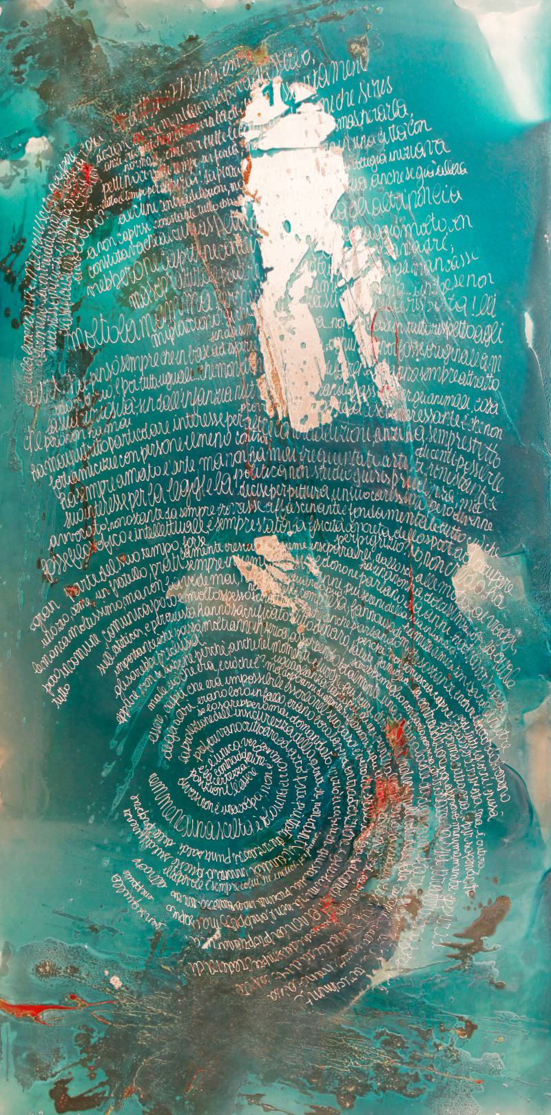 Smalti e resine animano lo splendore gelido dell’alluminio in un gioco espressivo che rivela e nasconde, sullo sfondo riflettente campeggiano spumeggianti ed impetuose le varietà cromatiche più accese in un libero e ribelle sfoggio di creatività. Infine, su questa appariscente scenografia pittorica compare il registro della sua presenza, una grande impronta , incisa minuziosamente attraverso un testo che riproduce le creste ed i solchi dell’epidermide.