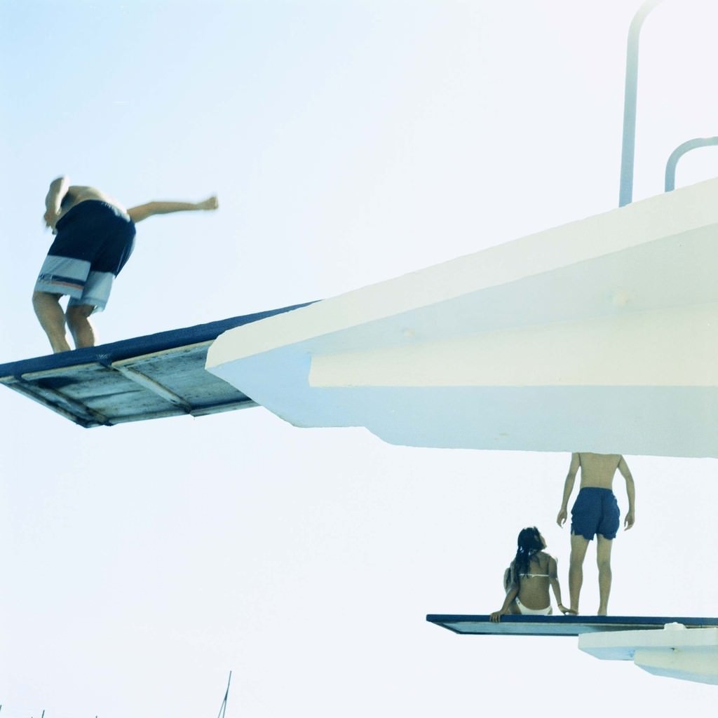 Nella serie titolata “The Pool”, le persone ritratte, colte nel tuffarsi, nuotare oppure semplicemente assorte nel rituale di prendere la tintarella, sono catturate in splendide composizioni, in instantanee che gelano i movimenti, con sfondo paesaggi di serenità e calma, bagnati da una calda luce estiva. Sebbene le loro azioni ed espressioni siano naturali e composte nella loro spontaneità, la scena sembra essere orchestrata ad-hoc, quasi un setting cinematografico con i movimenti freddamente catturati nell’inquadratura della macchina fotografica.