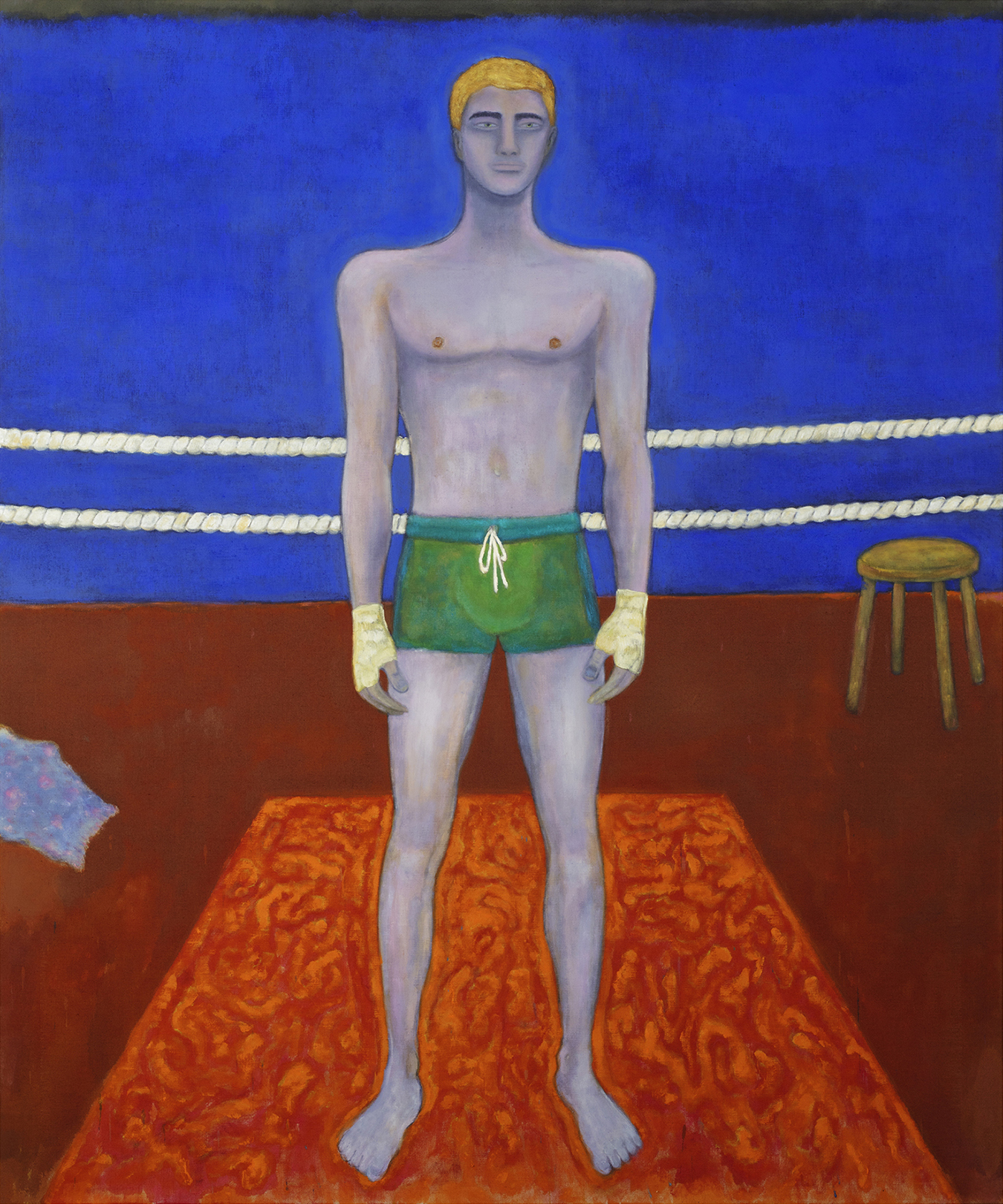Con le tre grandi tele Your Feeling Are Wrong, There’s Nothing You Can Do To Me (That I Haven’t Already Done Myself), entrambe del 2021 e Flag (2022), Kasper Sonne recupera la figurazione dei suoi esordi, ma lo fa riducendo al massimo i dettagli a favore di una sintesi che sa di primitivismo e ritorno all’ordine. Nello spazio definito sinteticamente e che i colori rendono quasi bidimensionale, i protagonisti hanno una consistenza scultorea. I colori, pochi ma accesi, sono quelli della Transavanguardia italiana, mentre i soggetti dei dipinti, due pugili ed un ragazzo che indossa pantaloncini da calciatore, assurgono ad archetipi contemporanei. Con i loro volti inespressivi ed il loro isolamento, trasmettono una solitudine che è più psicologica che fisica. Presenze che universalizzano la sensazione di spaesamento dell’uomo nel confronto con la natura circostante, in una costante oscillazione emotiva che sottende la pulsione di morte.