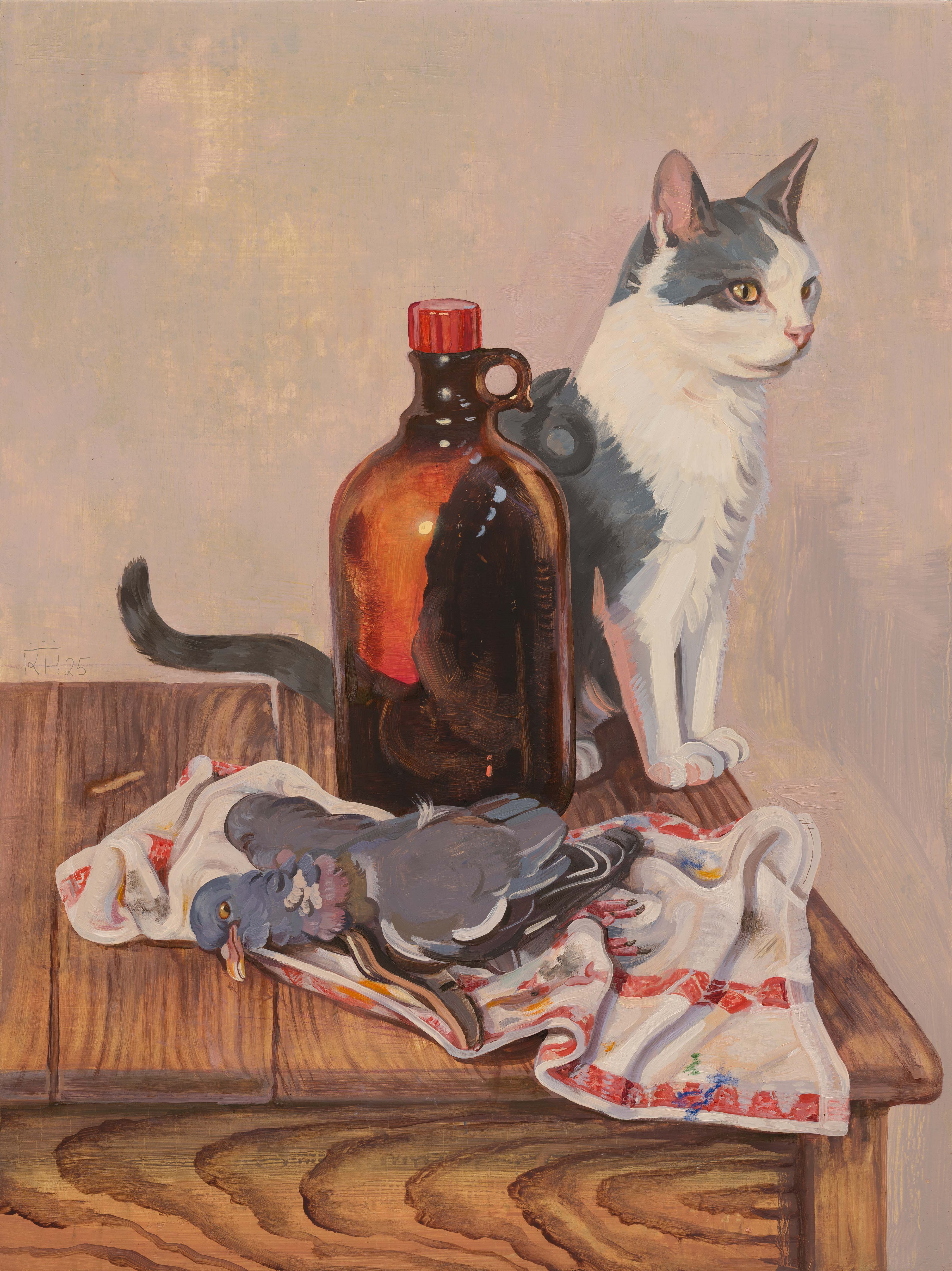 Brodo, parola italiana che significa “broth”, funge sia da metafora che da metodo. Heck immagina la società come una miscela collettiva, una sostanza in continua trasformazione, dove ogni elemento, nutritivo o corrosivo che sia, influisce sull’insieme. “Si possono inserire certi ingredienti in una società che la migliorano o la peggiorano”, osserva. “La mostra esplora il modo in cui si combinano questi ingredienti per ottenere un buon brodo.” Le sue nuove opere presentano questi ingredienti come frammenti visivi ed emotivi: amici e conoscenti che preparano il brodo, gli animali, sua figlia e se stessa. Ogni figura assume il doppio ruolo di soggetto e simbolo, una particella nella più ampia chimica della vita che Heck mescola sulla tela.