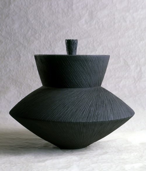 Christiane Wilhelm ci propone vasi, piccoli contenitori, grandi ciotole nelle quali, come in un esercizio di calligrafia, il segno diventa il tema intorno al quale ruota tutta la sua arte. Ed allora ecco che alcune opere “in nero” (per parafrasare la ricerca dell'artista a quella alchemica del famoso romanzo di Marguerite Yourcenar) si arricchiscono di graffiti appena accennati che danno alla supeficie la delicatezza di una fibra naturale o di una stoffa di seta. Il tutto impreziosito ulteriormente da leggere sfoglie di argento o d'oro, a completare la misteriosa alchimia nascosta nella bellezza di queste opere.