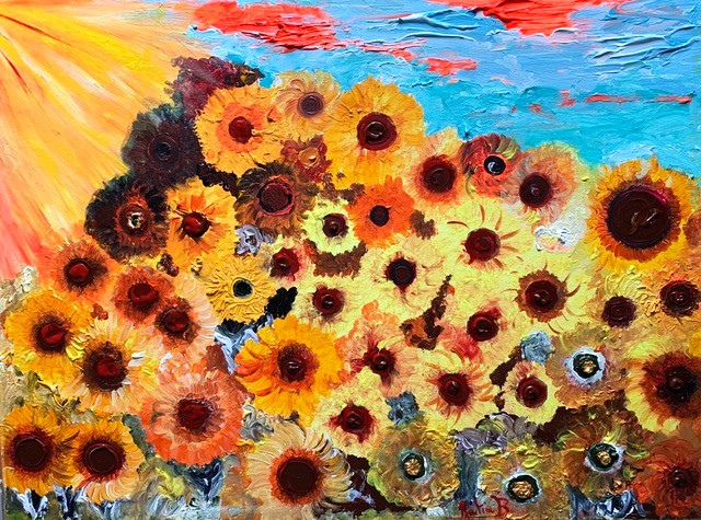 Diversi sono i soggetti presenti nelle sue opere che, come fuochi d’artificio, colpiscono lo sguardo: possiamo camminare in un campo di girasoli, in un pomeriggio di mezza estate, così come possiamo essere travolti dalle onde azzurre e tumultuose di un mare tempestoso, cercando di raggiungere un faro lontano.