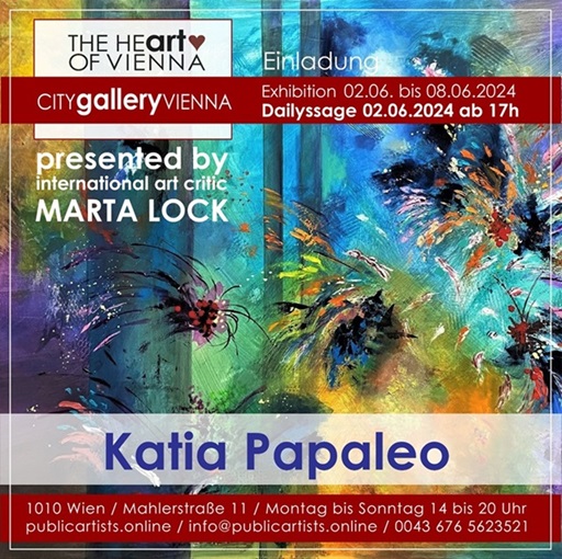 L'artista milanese Katia Papaleo, già conosciuta all'estero grazie alle sue numerose partecipazioni a fiere e mostre internazionali, porterà nella capitale austriaca diciassette tele che saranno protagoniste di una mostra personale all'interno degli ampi spazi della CityGalleryVienna, in Mahlerstraβe 11, a un passo dalla celeberrima Opera House e dal Palazzo della Secessione. La mostra avrà luogo dal 2 all'8 giugno 2024 e vedrà esposte alcune tra le tele più tradizionali dell'artista, quelle appartenenti a quel Realismo Magico da lei completamente rivisto e adattato alla sua indole sognatrice e immaginaria in cui la realtà si confonde con il sogno entrando nella dimensione simbolico-surreale, e altre opere appartenenti a una produzione più recente in cui la parte figurativa va a mescolarsi con un Espressionismo Astratto che non riesce mai a perdere il contatto con l'osservato e dove i colori si legano indissolubilmente alle sensazioni che l'artista desidera si manifestino sulla tela.