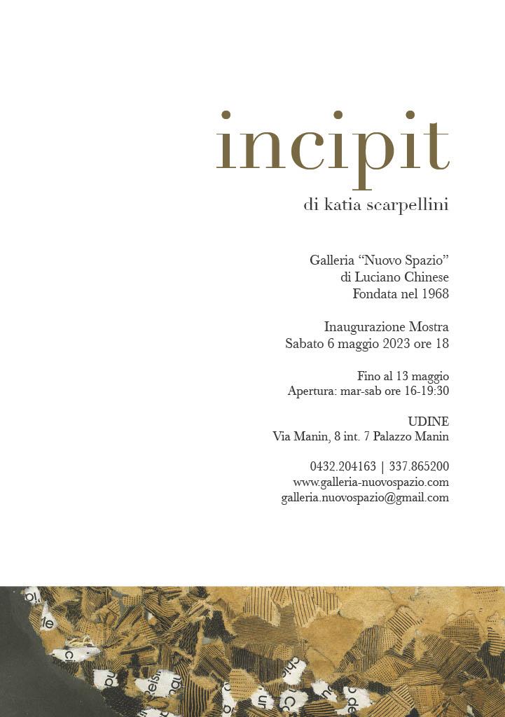 In questa mostra alla Galleria “Nuovo Spazio”, sede di Udine, Katia Scarpellini presenta, i suoi collage, i quali rappresentano la sua storia personale ed inedita.” Tutto nasce dal desiderio di un nuovo spazio, da un frammento isolato e de-contestualizzato. Recuperato cioè da quell’asfittico e decadente sottofondo che viviamo molto propizio a nuovi incipit” (Katia Scarpellini)