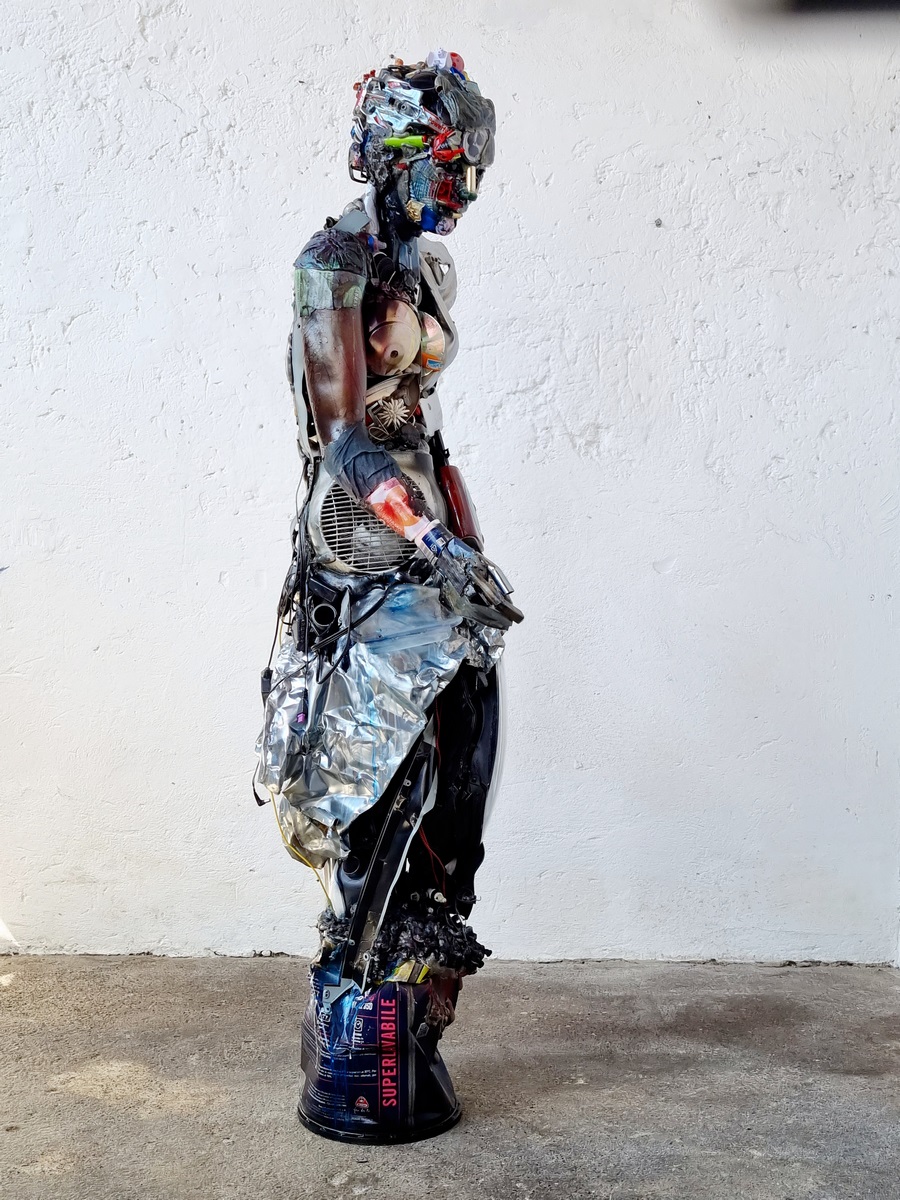 Dario Tironi espone nove sculture di grande formato. Sei di queste sono state realizzate tra il 2014 e il 2022, mentre tre grandi opere sono state realizzate appositamente per la mostra. Le sculture sono collocate all’aperto, lungo il percorso di visita. Solo un’opera, “Digital waves”, viene installata all’interno, su una parete della Casermetta Veneziana. Scrive Marina Pizziolo: «La memoria del futuro è l’anima delle sculture di Tironi. Le sue figure arrivano dal dopo che seguirà fatalmente il nostro compulsivo accumulo di oggetti. In un processo di antropogenesi le nostre scorie si aggregano fino ad assumere forme organiche, destinate a prendere il nostro posto. Robot malinconici raccontano una catastrofe che è stata, si ergono come erme a monito di una salvezza ancora possibile. Dario Tironi esprime la sua fede nell’uomo, attraverso figure e forme che riescono a sublimare lo sfacelo prodotto dalla massa enorme dei nostri rifiuti, approdando a una nuova forma di estetica. Un carrello della spesa pieno di oggetti di scarto inventa ed eleva un’architettura gotica. Gli oggetti di plastica che inquinano i nostri mari colorano il corpo della “Bagnante contaminata”, senza riuscire a rovinarne la bellezza, protetta dalla classicità delle sue forme. È la cultura e l’amore della bellezza il nostro ultimo baluardo».