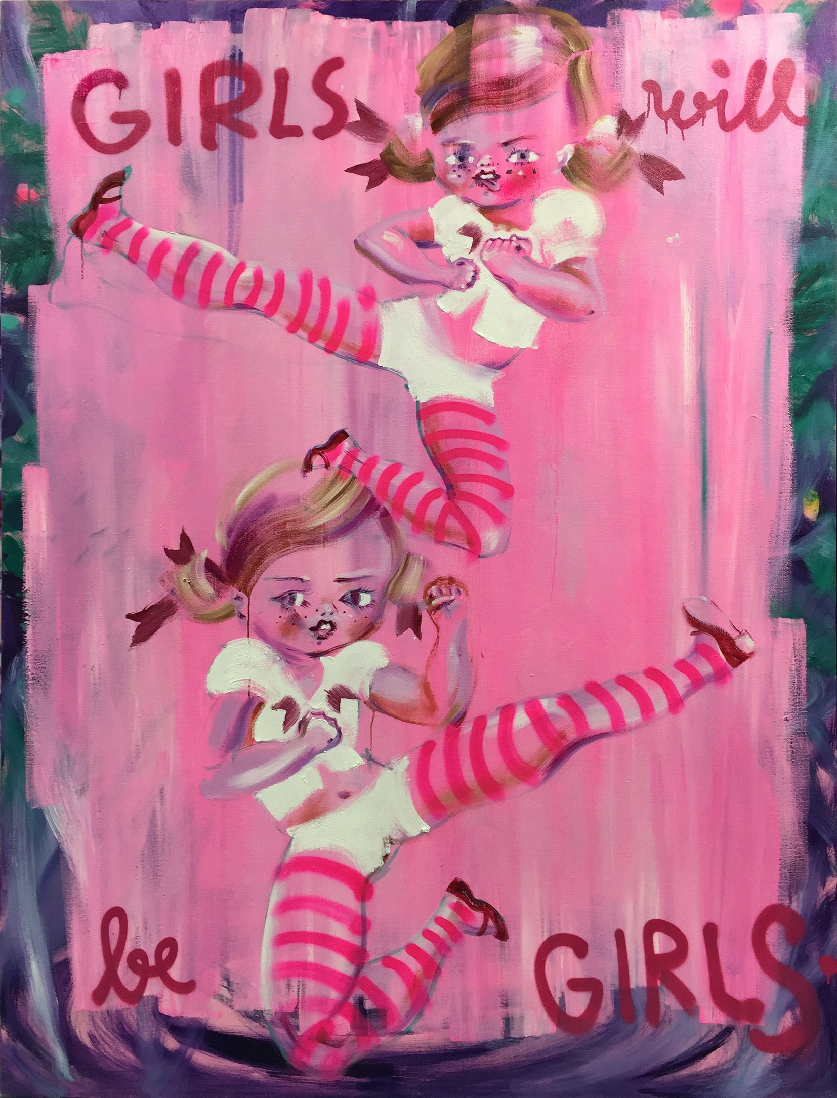 Dare seguito alla storia espositiva e al contesto culturale passato di un gruppo di opere rigenerandole – tramite “retouch” nell’ambito di nuove occasioni sociali ed estetiche nella continuità di quel contesto, come dandogli forma. È un po’ questa l’operazione di Katja Tukiainen e in seconda battuta dei curatori con la scelta di proporre nella Futurism&Co alcuni quadri modificati nell’atelier del Macro Asilo – nella settimana che precede la mostra – e ancor prima, nel 2016 esposti nella sua prima personale romana (presso la Core Gallery – Luna Park Abbandonato): si tratta dei suoi “quadri italiani”. Da questa sensibilità per il contesto, come per la lingua italiana che conosce e parla - si può aprire il discorso sulla sua ricerca formale che ha spesso visto integrarsi elementi “old fashion” e “lolitesque”, anche nella realizzazione di fastose e accattivanti ambientazioni in Hotel e altri luoghi. Katja Tukiainen, una delle più importanti artiste contemporanee finlandesi, lo è anche perché è stata l’artefice di una delle prime e più consistenti rappresentazioni della categoria estetica della cuteness, dei suoi moduli di fusione tra soggetto e oggetto, tra violenza e amorevole passività. Categoria poi variamente reinterpretata nei due decenni successivi da centinaia di artisti avendo, in Giappone, la sua manifestazione più potente e concettuale nel movimento Superflat. Le icone ricorrenti del suo lavoro sono ragazze seducenti e ribelli, derivate dai fumetti, parenti anche per questo di quelle di Yoshitomo Nara, Mr. Aya Takano. Ma lungi dall’esserne dei rifacimenti, l’artista ha costruito con esse un suo mondo immaginativamente autonomo, basato sulla preminenza dei colori viola, rosa e magenta in chiave espressionistica su modelli morfologici che mentre sono grossomodo affini per lo schema di base infantile – Kindchenschema – sono però fisiognomicamente complessi e personali – si veda ad esempio lo strano coesistere di un’apparenza “anziana” e infantile nelle grandi sculture in vetroresina – Cuteness overdose. Un modo forse anche ambiguamente sadico, oscillante tra soavità e tenerezza e cattiveria con riferimento consapevole a Henry Darger. La mostra propone inoltre alcuni quadri più recenti, che mostrano un accento sugli aspetti energetici e muscolari del suo soggetto prediletto, con invenzioni formali-logiche come la trasformazione delle calze delle ragazze in mirabolanti anelli energetici fluorescenti. Perfettamente espressivi del tema. Fino poi alle piccole sculture in ceramica che recuperano certa fusione oggettuale del rappresentato come fossero acrobazie e pose snodate dei piccoli ammiccanti soggetti.