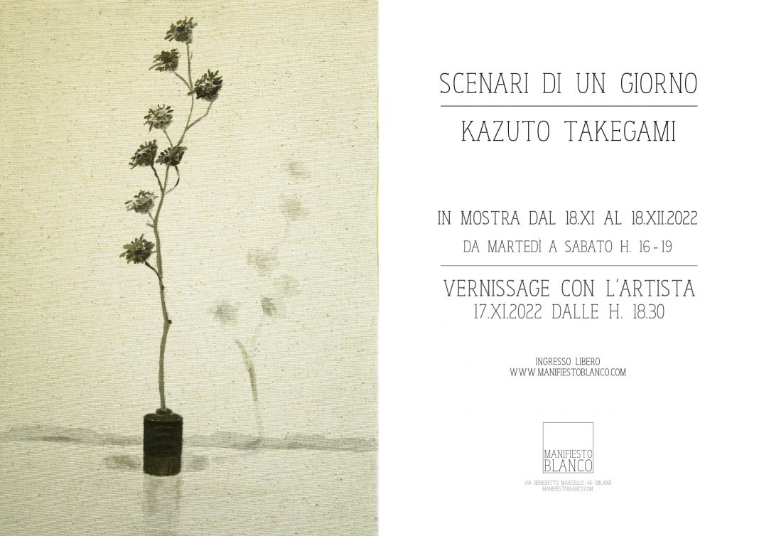 La mostra personale di Kazuto Takegami a Manifiesto Blanco si struttura in un percorso espositivo articolato che comprende circa 10 opere inedite allestite a parete, composte in prevalenza a dittico e realizzate ad olio, tempera ed inchiostro di china, la tecnica mista che maggiormente caratterizza i lavori su tela dell’artista. L’affaccio vetrato su via Benedetto Marcello è allestito, per l’occasione, in forma di shoji tradizionale giapponese, decorato da disegni ad inchiostro di china e pigmenti naturali. Completano infine l’allestimento alcuni disegni ad inchiostro su carta. La galleria diventa quindi per l’occasione uno spazio fluttuante e mutevole, popolato da paesaggi marini ed intrecci silvestri, che avvolgono i sensi e accompagnano il visitatore all’interno dei dolci e malinconici scenari di brevi momenti resi eterni dall’arte pittorica di Takegami.