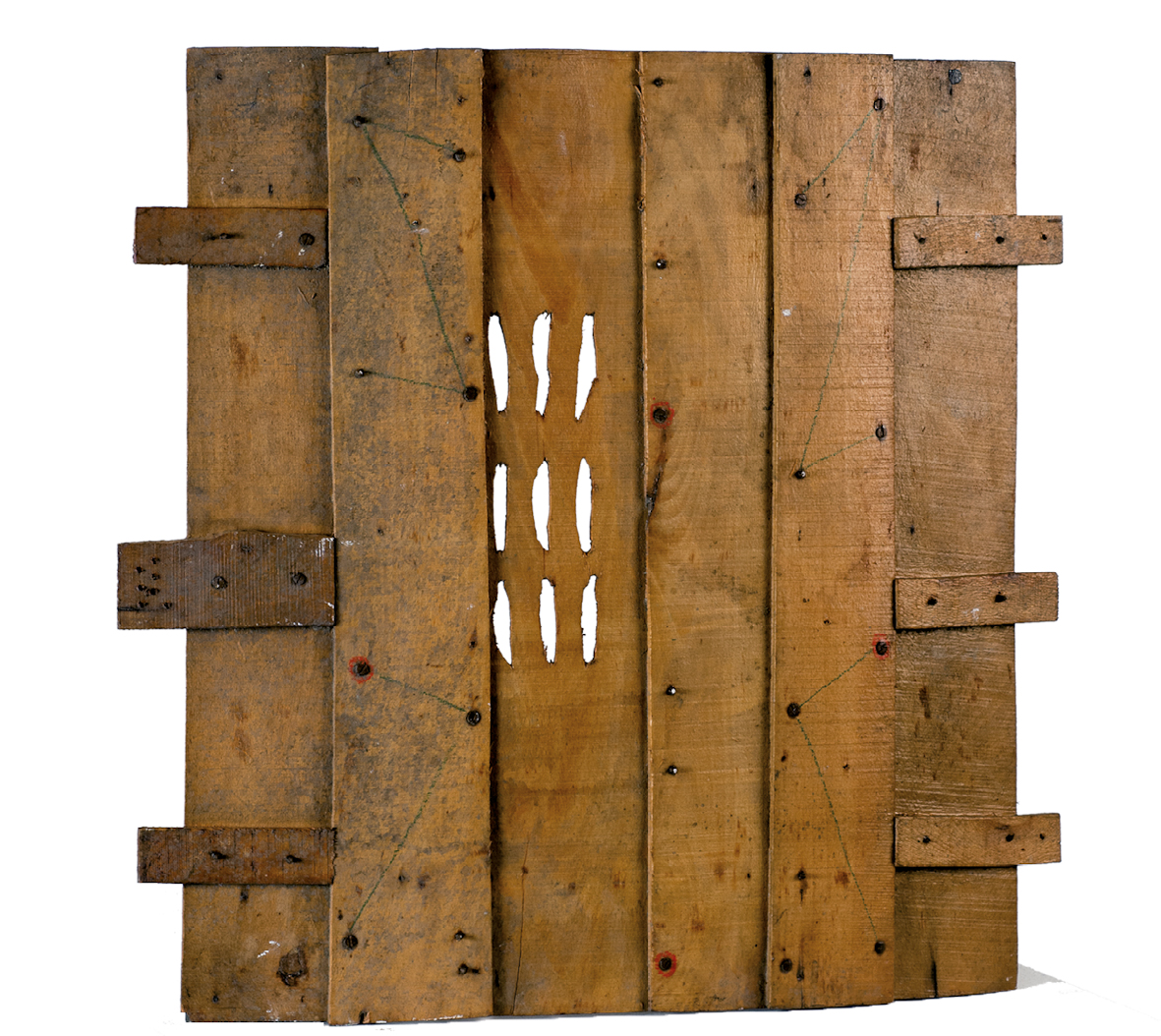 All’ingresso da il benvenuto al visitatore l’opera “YU-84” detta anche “scudo”, a difesa ma anche a simbolo di partenza, in quanto la sua forma ricorda anche quella di una barca.