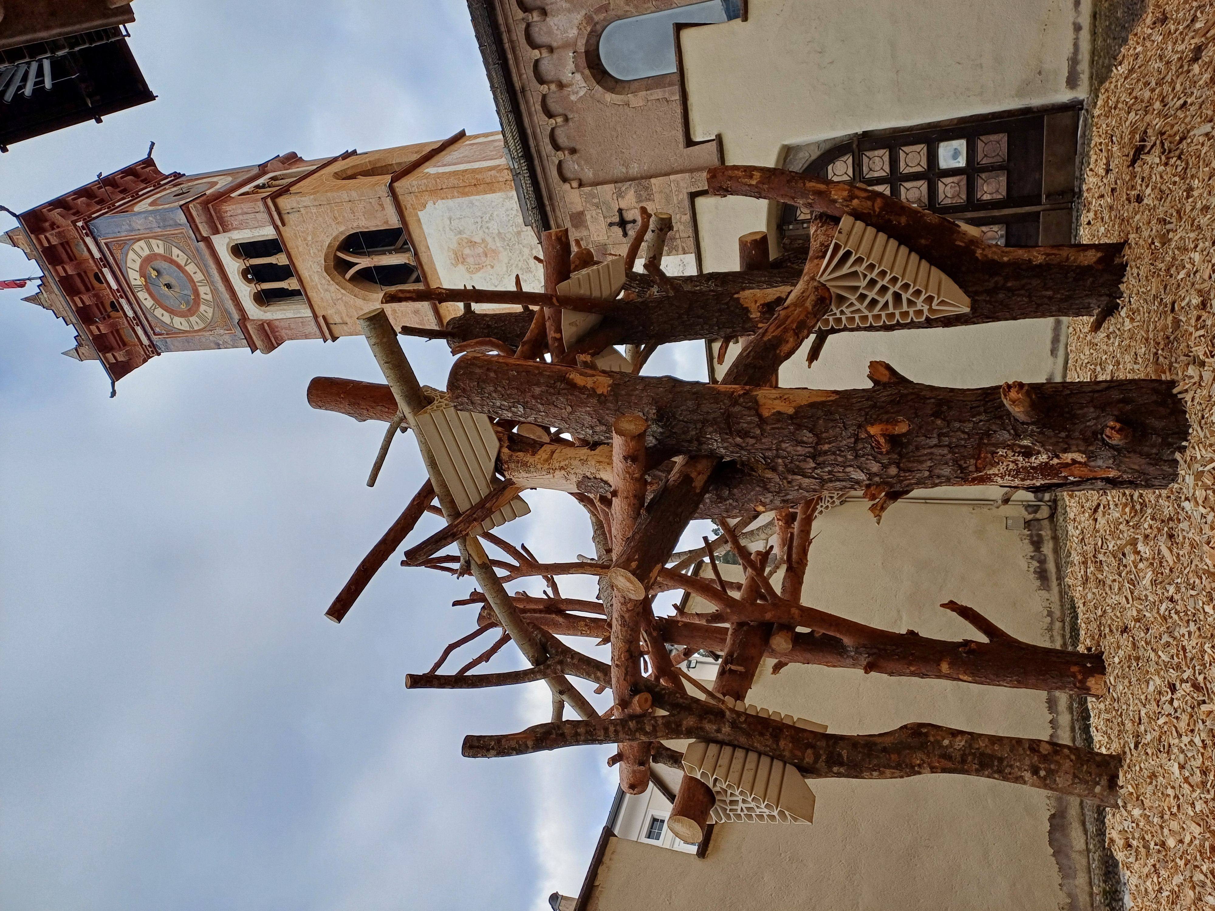 Esposta a Cavalese, nel cuore della Val di Fiemme, l’opera assume un valore ulteriore restituendo alla comunità locale un frammento della propria storia trasformato in linguaggio architettonico e culturale. La Magnifica Comunità di Fiemme, attraverso questa esposizione, diventa interprete di un messaggio universale, in cui la resilienza alpina si traduce in paradigma di rigenerazione che parla al mondo intero.