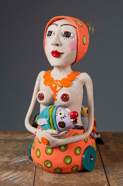 Fra soluzioni plastiche primordiali, raffinati complementi neo-mistici in raku design, dalla grande maestria di affermati ricercatori, la manifestazione conta, per il secondo anno consecutivo, anche la presenza di Frédérique Fenouil. Arriva da Générargue Gard, nel sud della Francia, ed è un’autrice ispirata alle linee primordiali dell’Art Brut, ma anche dalle squillanti cromie di evocazione pop art in sculture-ceramiche, che aprono il mondo privato di una ironica, onirica e sensuale “femme libre”, che anima e che piega, in un espressionismo irresistibile, contaminato di decorazioni klimtiane in oro, la materia terrena custode e narrante.