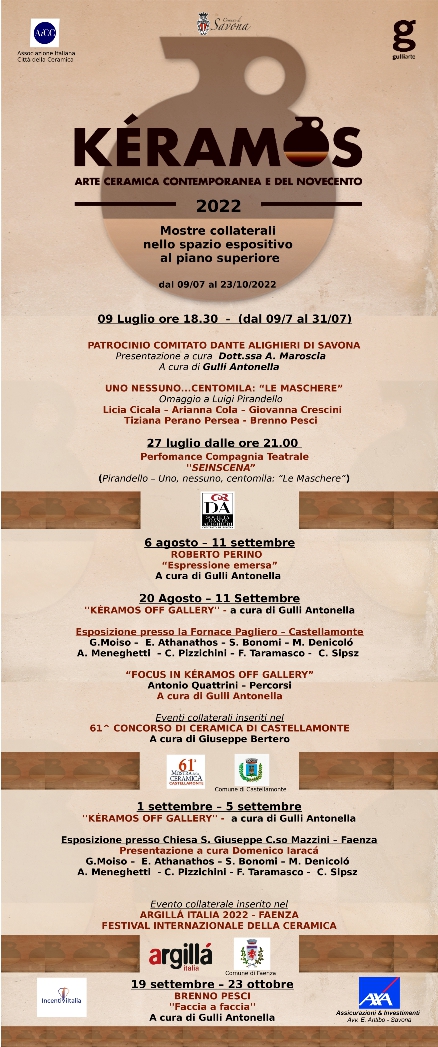 Gli artisti, che sono presenti nella mostra madre Kéramos2022 e nelle collaterali, si alterneranno, esponendo diverse opere a seconda della tematica, per creare sempre un nuovo imput per visitare la rassegna.