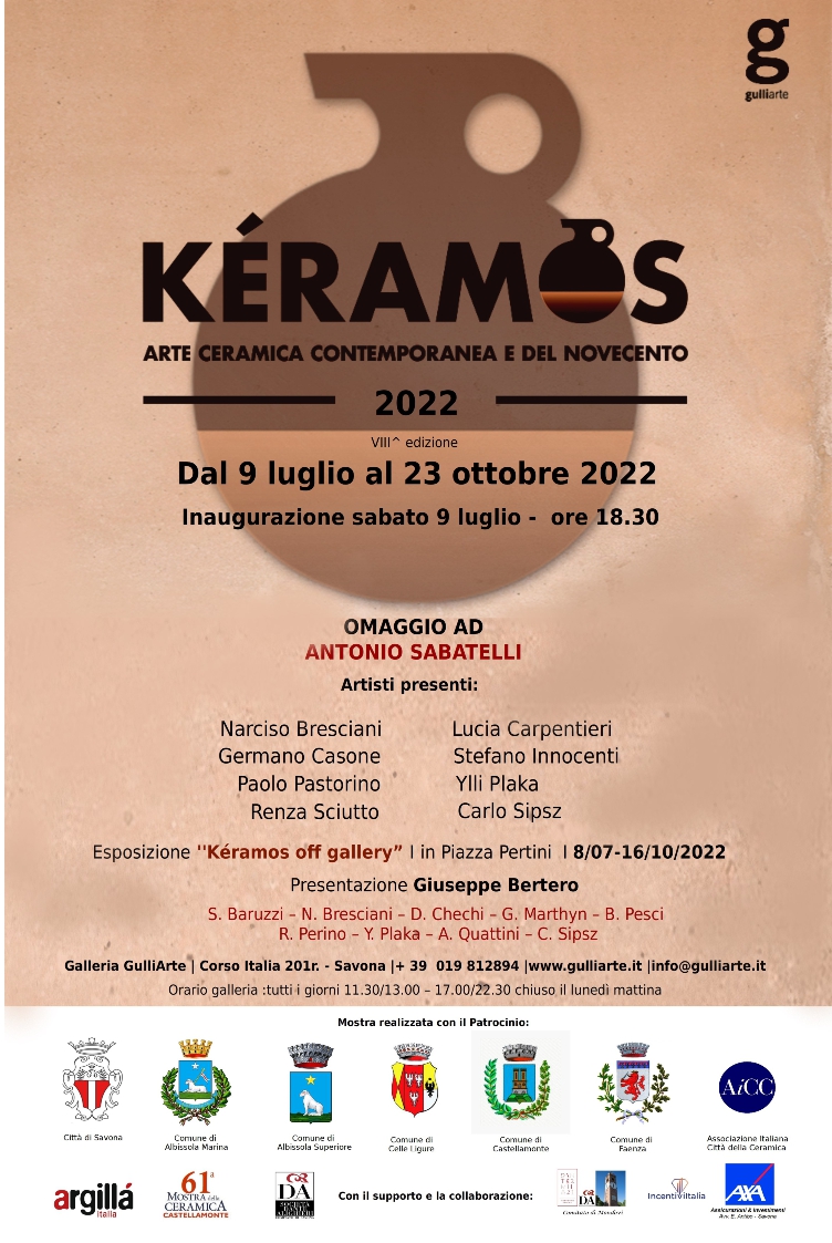 Durante la programmazione della Rassegna Kéramos2022, che durerá fino al 23 ottobre2022, saranno inaugurate nuove mostre e collettive e performance teatrali a tema, che verranno comunicate dalla Galleria Gulli, a seconda del calendario.