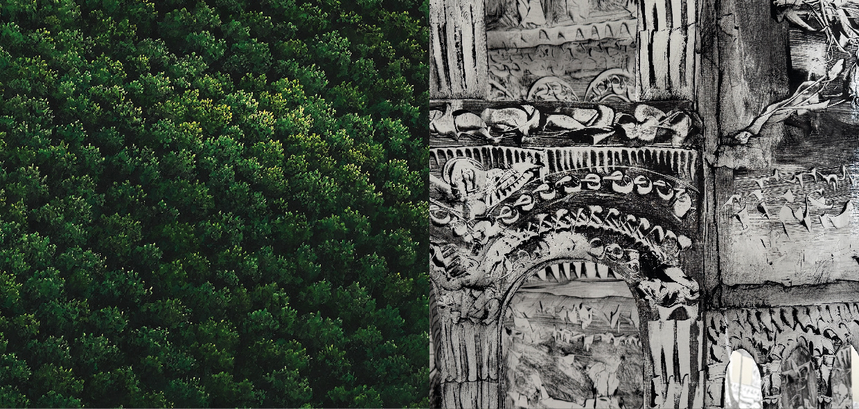 Nell’androne, i Totems di Franco Passalacqua sono installati con un’interpretazione monumentale, indagando la natura del bosco come struttura generativa e salvifica: l’albero diventa modulo e sistema visivo, trasformandosi in trama e linguaggio assorbendo l’attenzione come un mantra naturalistico.