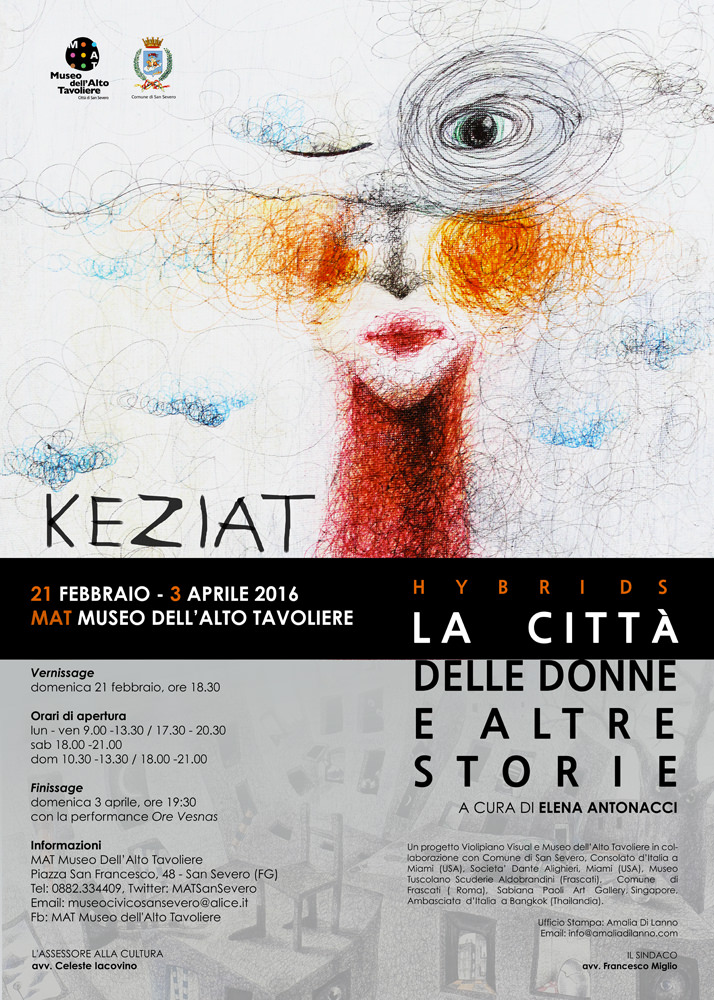 Il 2016 sarà un anno intenso per l’artista pugliese Keziat. Dal 21 febbraio al 21 ottobre è in programma infatti un nuovo straordinario ciclo internazionale di mostre personali intitolato Hybrids, con testo critico unico a cura di Amalia di Lanno. La serie partirà, anche questa volta, dal MAT – Museo dell’Alto Tavoliere di San Severo (Foggia), città natale dell’artista. Dal 21 febbraio al 3 aprile il Museo presenterà in anteprima l’esposizione “La città delle donne e altre storie”, a cura di Elena Antonacci, direttrice del MAT. La mostra è un chiaro omaggio alla visione onirica di Federico Fellini e alla figura dell’artista Andrea Pazienza, autore del manifesto del film dal quale, in parte, il titolo di questa mostra è ripreso. Dal 19 maggio al 23 giugno Keziat sarà negli Stati Uniti con “Stralunata”, a cura di Sabiana Paoli, presso la Società Dante Alighieri di Miami, in Florida. L’esposizione è realizzata in collaborazione con il Consolato d’Italia a Miami, molto attivo nel campo delle arti visive in una città in fermento anche grazie alla presenza di Art Basel. Dal 21 luglio al 13 agosto sarà la volta del Museo Tuscolano Scuderie Aldobrandini di Frascati, in provincia di Roma. Nel bellissimo spazio espositivo del Museo, ristrutturato dall’architetto Massimiliano Fuksas, si terrà “Attraversamenti in punta di penna”, a cura di Barbara Pavan. Hybrids si chiuderà a Bangkok con “On a biro”, dal 30 settembre al 21 ottobre. La mostra farà parte del cartellone del prestigioso festival italiano organizzato dall’Ambasciata d’Italia a Bangkok; manifestazione di assoluto valore che porta ogni anno i migliori artisti italiani in Thailandia. Hybrids è il secondo ciclo espositivo internazionale di Keziat; segue quello del 2012-2014 intitolato Visionaria, con mostre al MAT, Museo dell’Alto Tavoliere di San Severo (Foggia), Casa Italiana Zerilli-Marimò di New York, Centro Culturale Elsa Morante di Roma, Sabiana Paoli Art Gallery di Singapore e all’Istituto Italiano di Cultura di Amsterdam. “Disegni su carta, tela, realizzati con la semplicità di una biro, video animazioni e video installazioni che hanno come filo conduttore la presenza costante di osservatori mediatici, sono soltanto alcune delle modalità espressive attraverso cui Keziat snoda e rivela il suo ‘racconto magico’. L’opera di Keziat è la visualizzazione di un mondo in cui coesistono differenti realtà, a volte contraddittorie, che si manifestano spesso mascherate tanto da apparire, a uno sguardo superficiale, perfettamente logiche e naturali. Nella volontà di non definire precise congiunzioni la visionarietà dell’artista spazia in ogni dove, scandaglia i nascondigli dell’animo, si propaga e supera i confini del probabile, fonde e confonde, reale e sovrannaturale, esperienza e fantasticheria, realizza un legame possibile in cui la fantasia è cosi vera e il mondo dell’immaginazione si conferma mondo dell’eternità”. Amalia Di Lanno