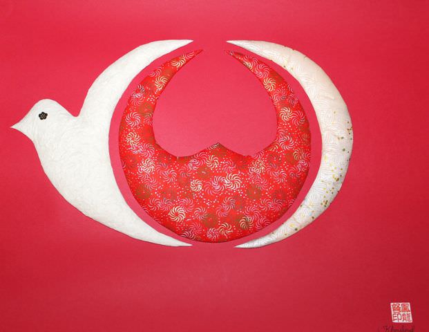 Ma se le realizzazioni Kurumi-e in stile giapponese di Khouloud ben incarnano, nei soggetti come nella tecnica e nei materiali, quegli elementi di forza-delicatezza, presenza-impermanenza, seduzione-rinuncia tipici della cultura giapponese, del tutto inaspettati sono gli esiti in cui la calligrafia si fa arabeggiante e le moschee danno al Kurumi-e un fascino nuovo, un omaggio dell’artista alla pacifica e arricchente convivenza di culture diverse.