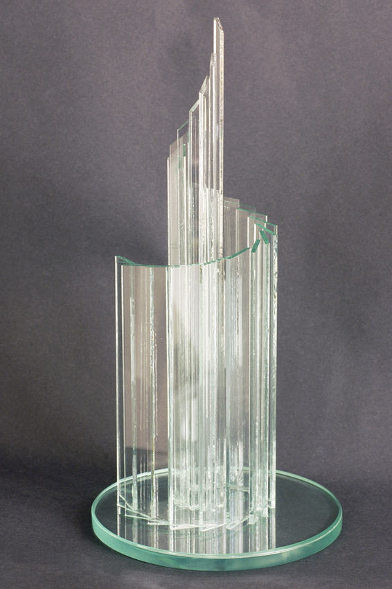 scultura si compone di una stratificazione e accumulazione di lastre di vetro che creano forme libere nella leggerezza visivamente