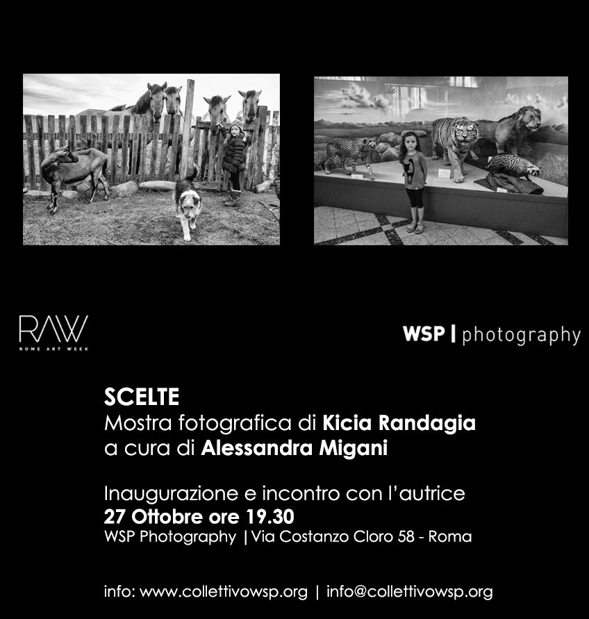 Nell’ambito di Rome Art Week, inaugurerà sabato 27 ottobre alle 19:30 presso la sede di WSP photography, in via Costanzo Cloro, la mostra fotografica di Kicia Randagia “Scelte” a cura di Alessandra Migani. La mostra sarà esposta fino al 14 novembre.
