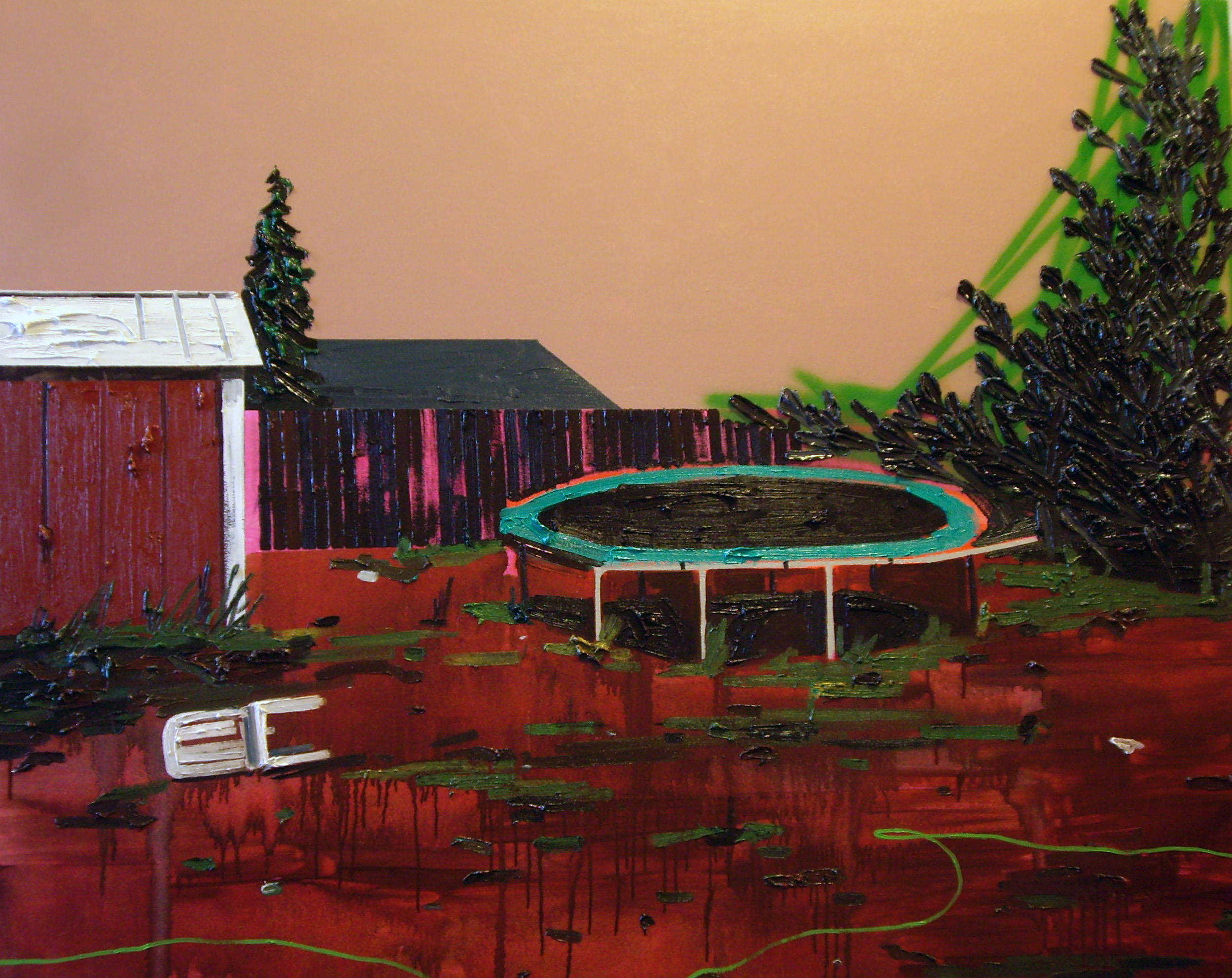 un’esposizione di dieci lavori pittorici, raccolta dalle ultime produzioni dell’artista. Nelle grandi tele definite da pennellate violente di colori acidi e corposi, vivono le atmosfere desolate di periferie dolorose. Spazi reali, descrizioni fedeli dei luoghi della sua infanzia brutalizzati da prefabbricati, recinti e automobili, simboli stridenti di un’estetica contemporanea.