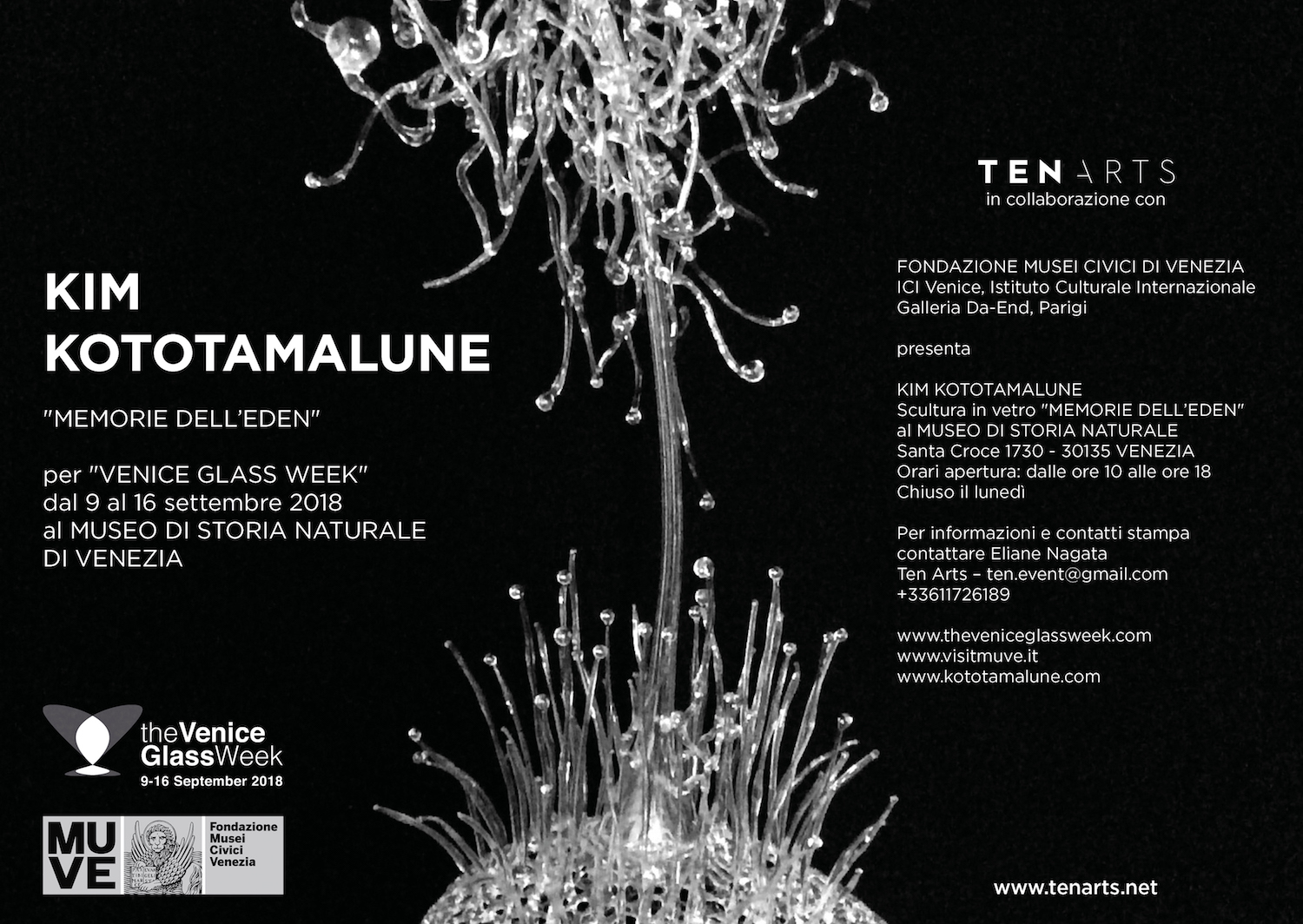 In occasione della seconda edizione di Venice Glass Week, Kim Kototamalune, artista che vive e lavora in Francia, grazie al sostegno di Fondazione Musei Civici, Ten Arts e ICI Venice - Istituto Culturale Internazionale, presenterà al Museo di Storia Naturale di Venezia dal 9 al 16 settembre 2018 una delle sue opere dal titolo: Memorie dell’Eden.