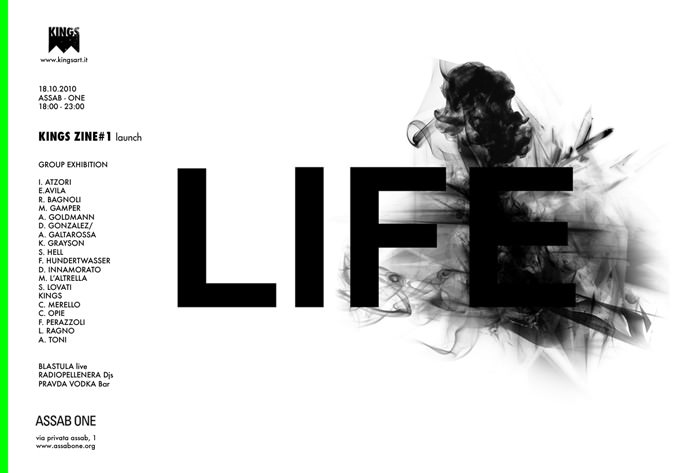 KINGS ZINE #1 LIFE, prima uscita del nuovo magazine d’artista autoprodotto di KINGS: “un viaggio tra utopie e possibilità urbanistiche contemporanee, un trip nel paese delle meraviglie dell’architettura e della cultura, un fotogramma della realtà metropolitana in cui ognuno è calato quotidianamente”