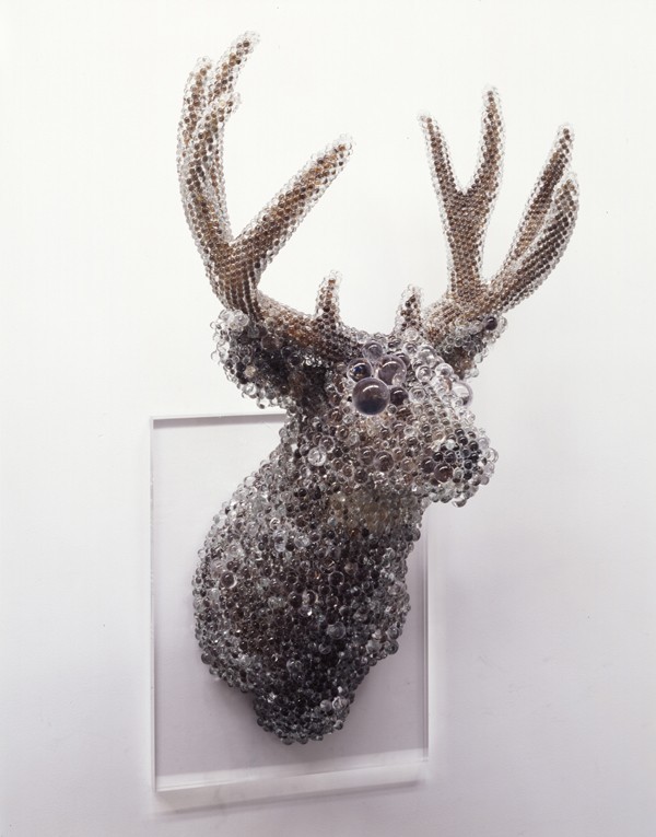 Kohei Nawa usa e-bay come fonte di approvvigionamento per i materiali, inizia la sua esplorazione inserendo una parola chiave nel motore di ricerca e poi, stabilito un contatto visivo con l’oggetto desiderato, lo acquista e lo rielabora. Prismi e biglie di vetro ricoprono e inglobano i più svariati soggetti, dai giocattoli alle teste di animali impagliate.