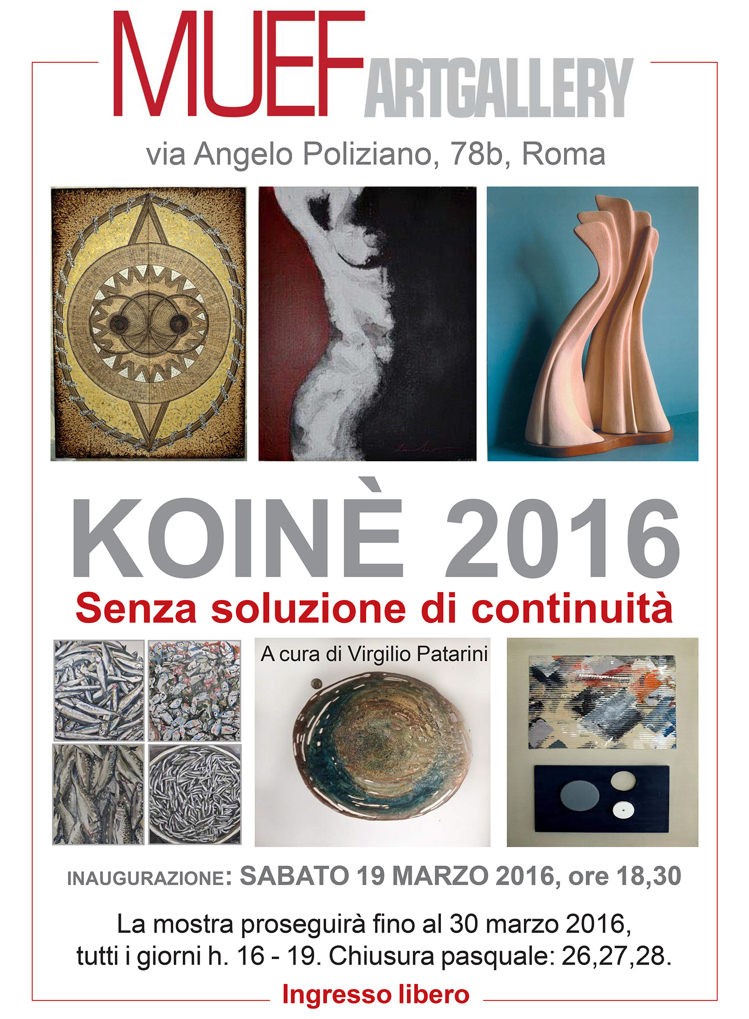 Si inaugura sabato 19 marzo 2016 alle ore 18,30 alla Muef Art Gallery di Roma, via Poliziano, 78b la mostra collettiva di pittura e scultura “Koinè 2016: senza soluzione di continuità –Per un linguaggio comune dell’arte contemporanea”, a cura di Virgilio Patarini con la collaborazione di Roberta Sole e organizzata da Zamenhof Art di Milano.