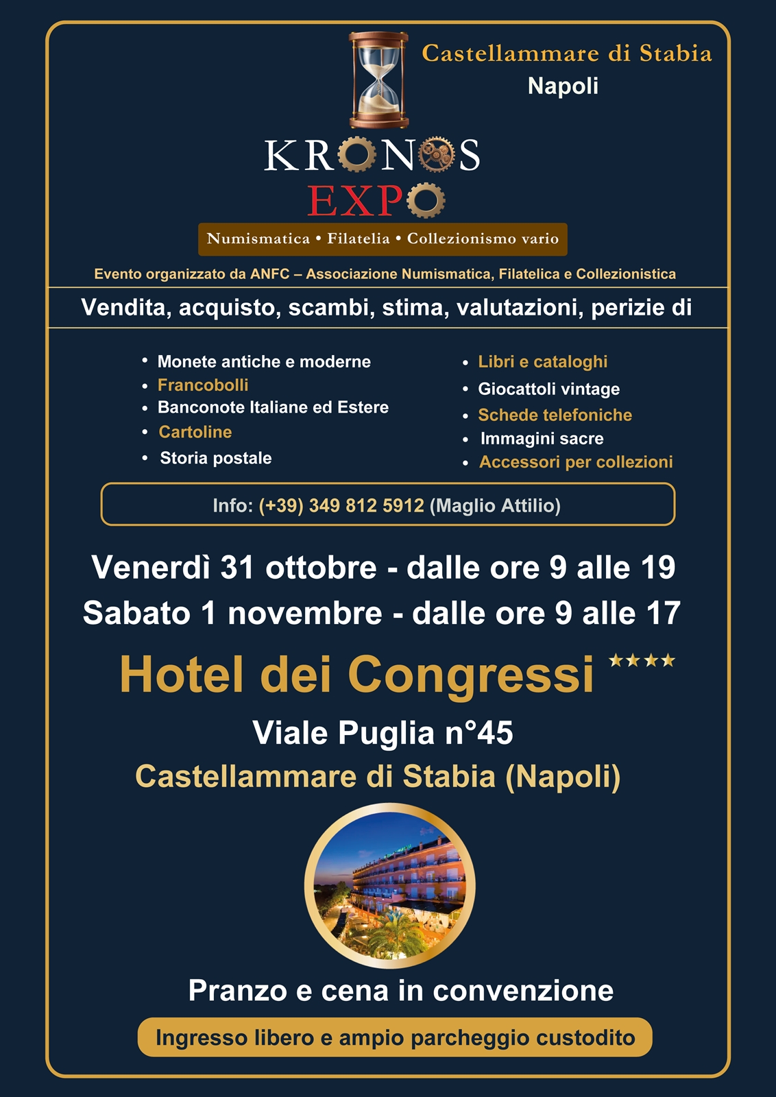 ANFC – Associazione Numismatica, Filatelica e Collezionistica presenta KRONOS EXPO 2025, l’appuntamento dedicato alla numismatica, filatelia, cartamoneta, cartofilia, storia postale, libri, schede telefoniche e oggetti da collezione.