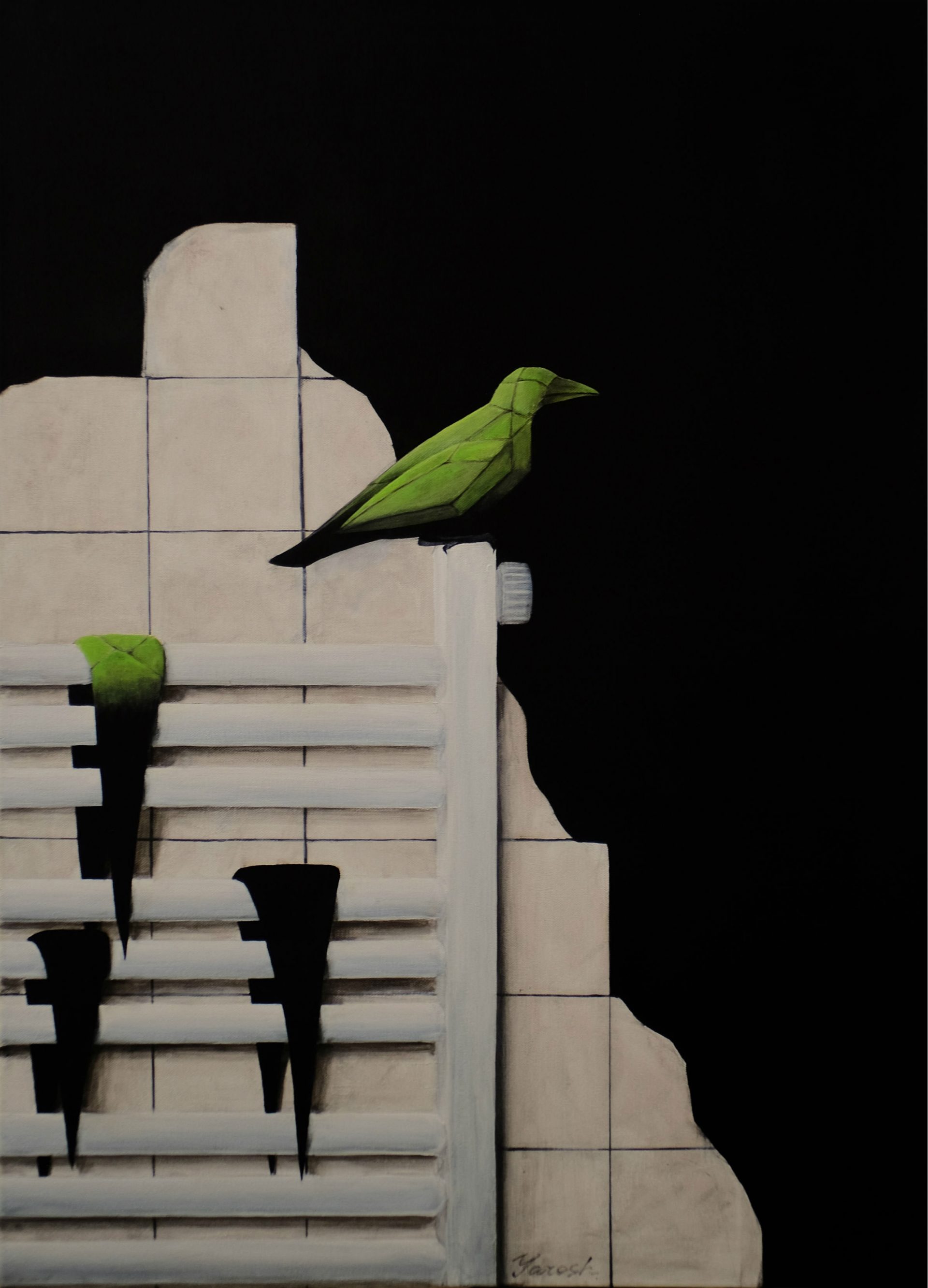 Trae ispirazione dagli oggetti quotidiani per la creazione delle sue opere, che attraverso l’ elaborazione del subconscio prendono il loro valore simbolico. Il suo processo creativo si basa sulla trasformazione onirica della relazione tra significato e significante. Ogni suo quadro è un sogno messo su tela per poi essere decifrato, oppure semplicemente, per lasciare il retrogusto delle emozioni come quello che ci capita di provare dopo il risveglio.