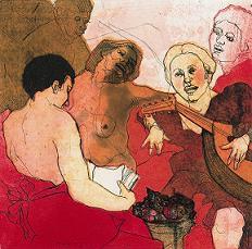 Nascono così le sue nature morte, vasi, tazze, frutti e fiori, e le sue figure, immagini muliebri in genere, che dispone ora da sole ora in dialogo ed infine in convegni amorosi e carnali, con espliciti riferimenti ai grandi maestri da cui attinge forza ed enigmi: dal Giovane Holbein a Caravaggio, e Goya e l’adorato Rubens, navigando tra le piacevolezze della carne, senza tuttavia tralasciare momentanei effetti di angoscia e scoramento nelle citazioni, di stile e soggetto, delle linee incerte e flessuose, titubanti ed ossute, di Schiele, in una visione che parallelamente rivela un’analoga sinuosa circolarità di pensiero nell’eterno ritorno dell’estasi e del dramma, dell’angoscia e della passione, della vita e della morte.