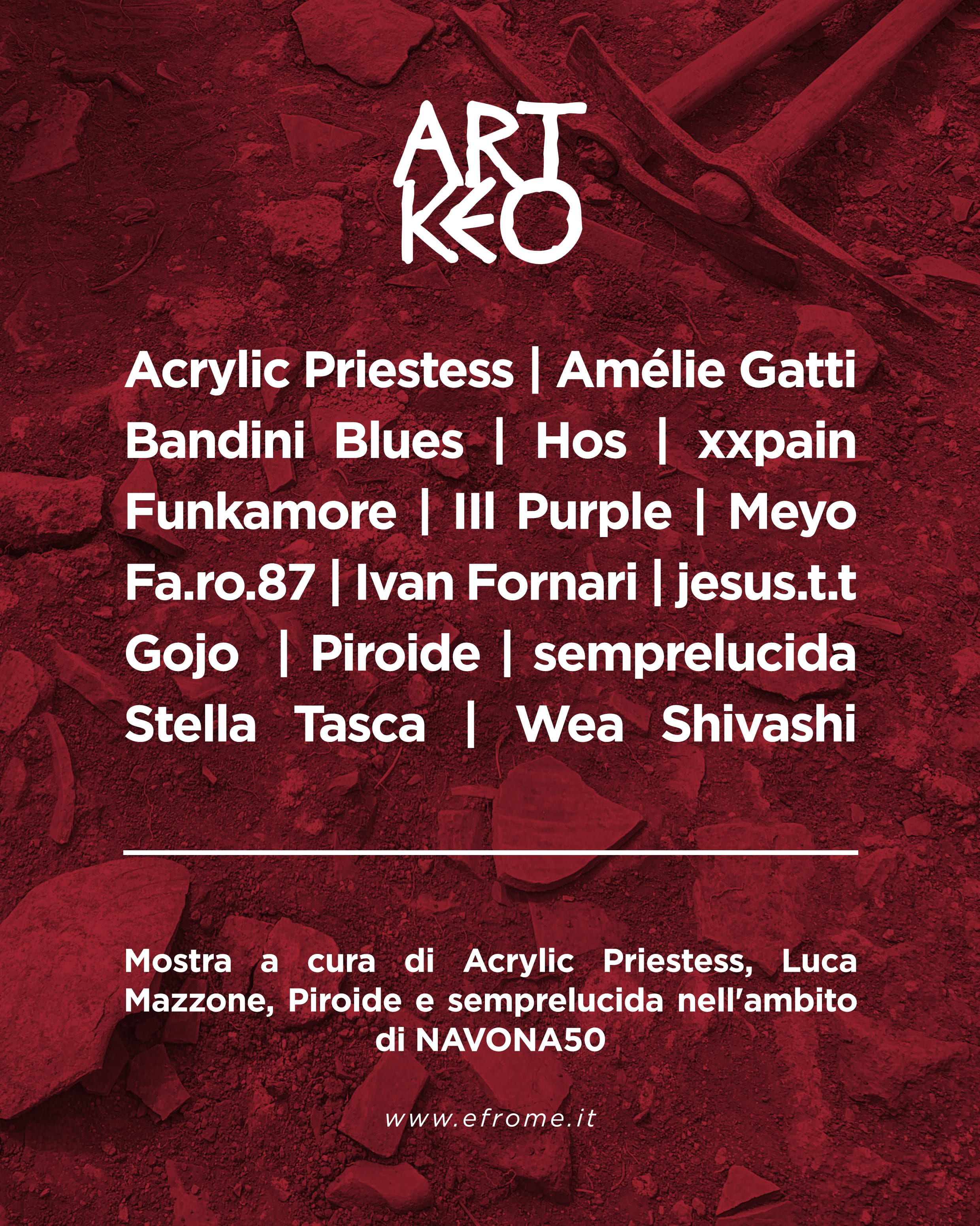 Artkeo è una mostra collettiva ideata per l’area archeologica di Piazza Navona, nata da una collaborazione tra l’École française de Rome e artisti tra cui AcrylicPriestess, Ill Purple, Piroide e Semprelucida. Un dialogo tra arte contemporanea e archeologia, con opere site-specific e videoart.