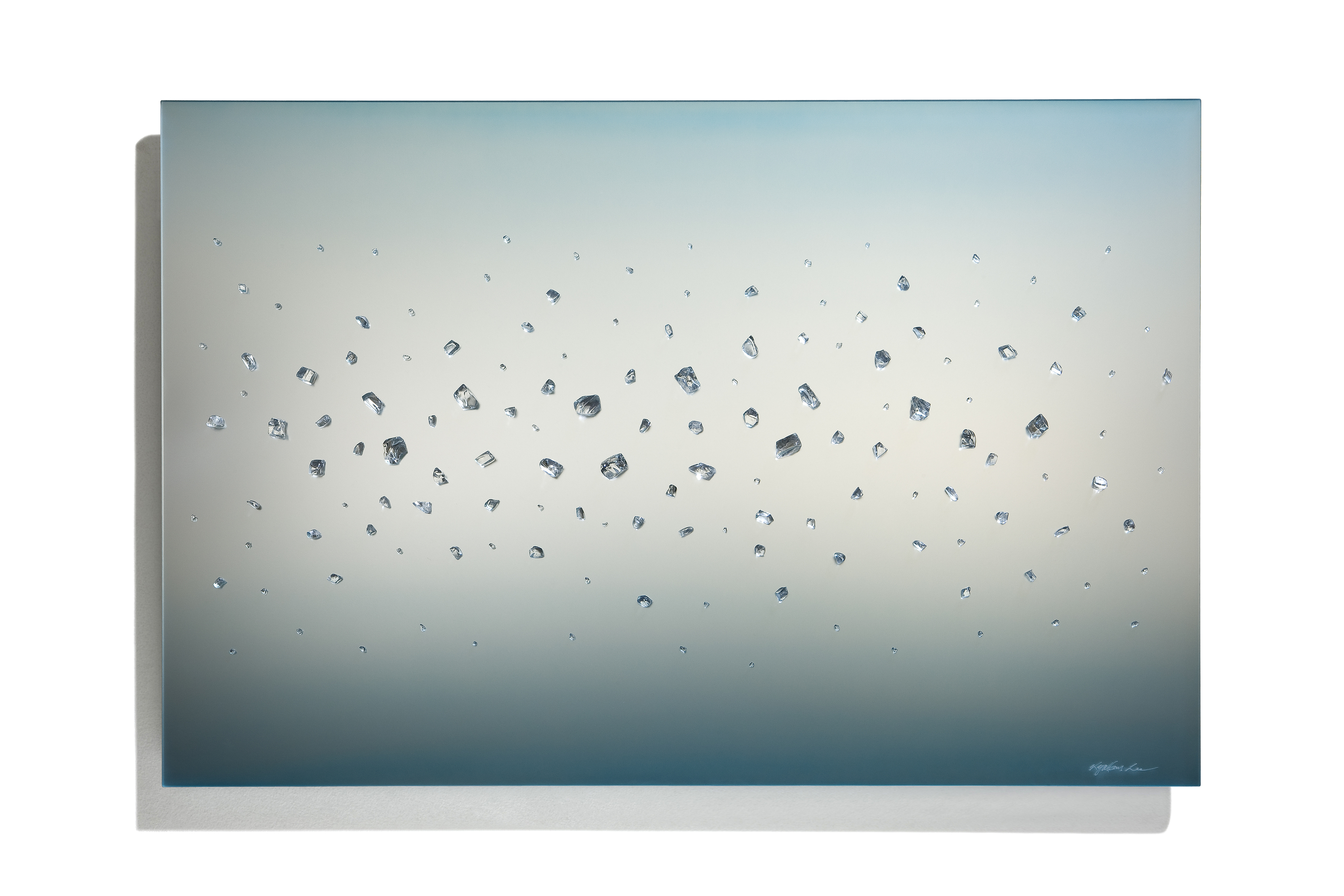 Dalle lastre in vetro satinato e caratterizzate da colori sfumati, emergono irregolarmente dinamici elementi in cristallo che paiono fluttuare nell’immobilità della materia.