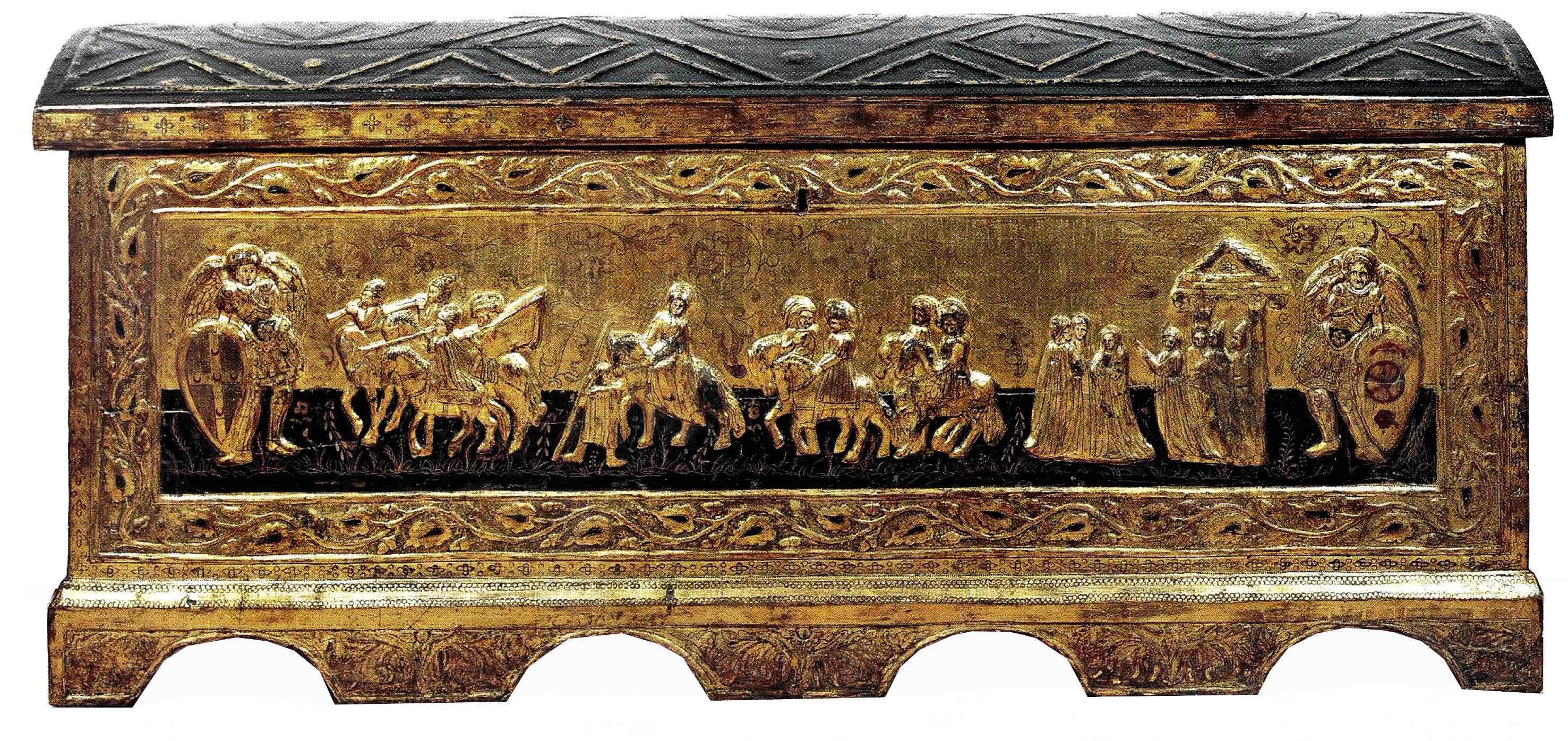 Tra gli oggetti che si potranno ammirare nel castello Della Monica vi sono alcuni pregevoli manufatti legati alla storia e all'arte dell'Abruzzo e del Regno, come il Cassone di legno di pioppo realizzato negli ultimi anni del Quattrocento che presenta un coperchio convesso, frutto di una ricostruzione ottocentesca. L’arredo ligneo è riccamente decorato in pastiglia dorata e dipinta con lo stemma senese della famiglia Piccolomini, importante famiglia che godeva di ampi feudi anche in Abruzzo. Raffinato è poi il piccolo contenitore in rame dorato incastonato di coralli che formano graziose decorazioni vegetali sulla struttura, e a raggera sul coperchio. Il cofanetto, di manifattura siciliana, verosimilmente trapanese, è databile nel Seicento per via della decorazione che in quel secolo è particolarmente diffusa sull’Isola.