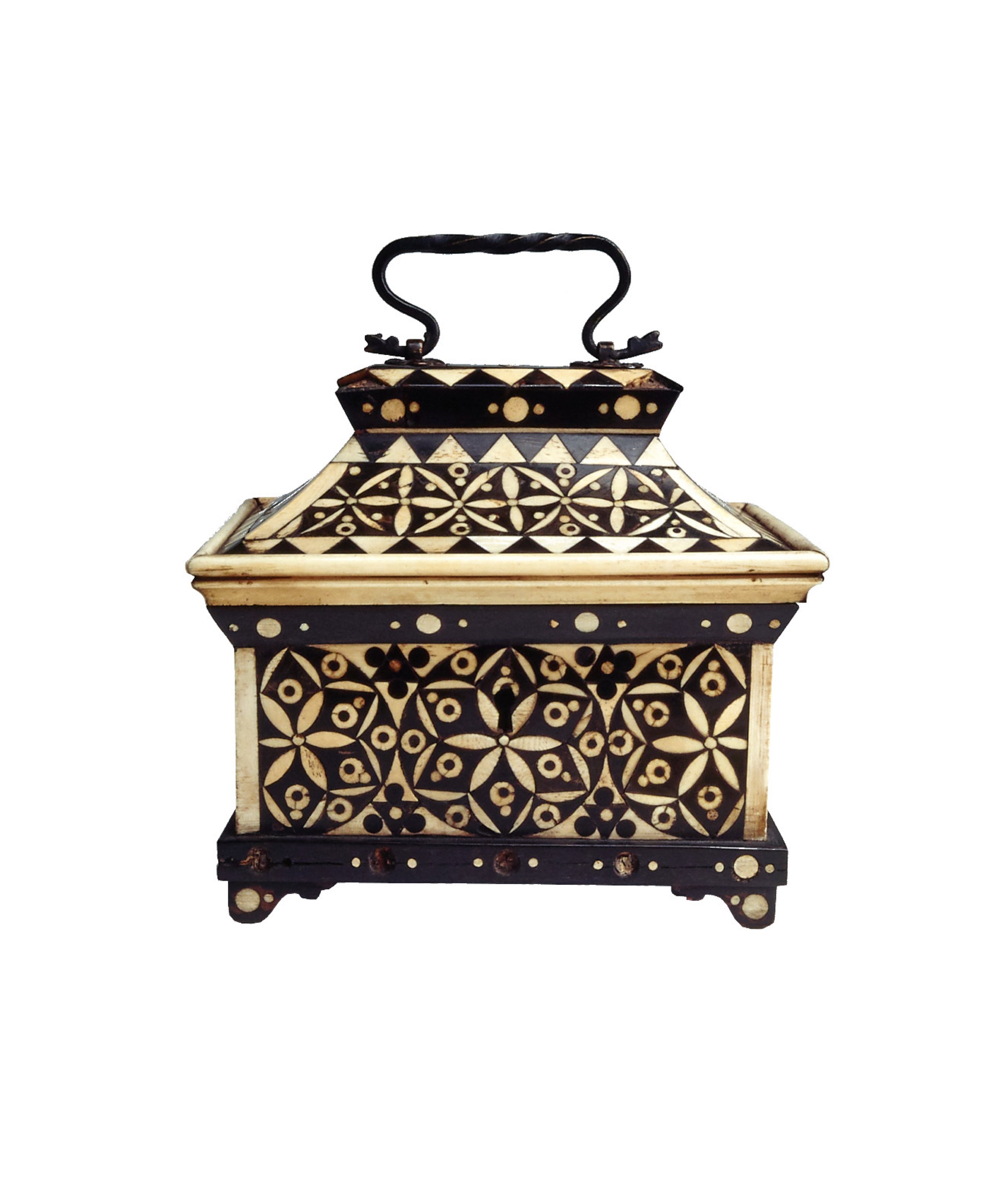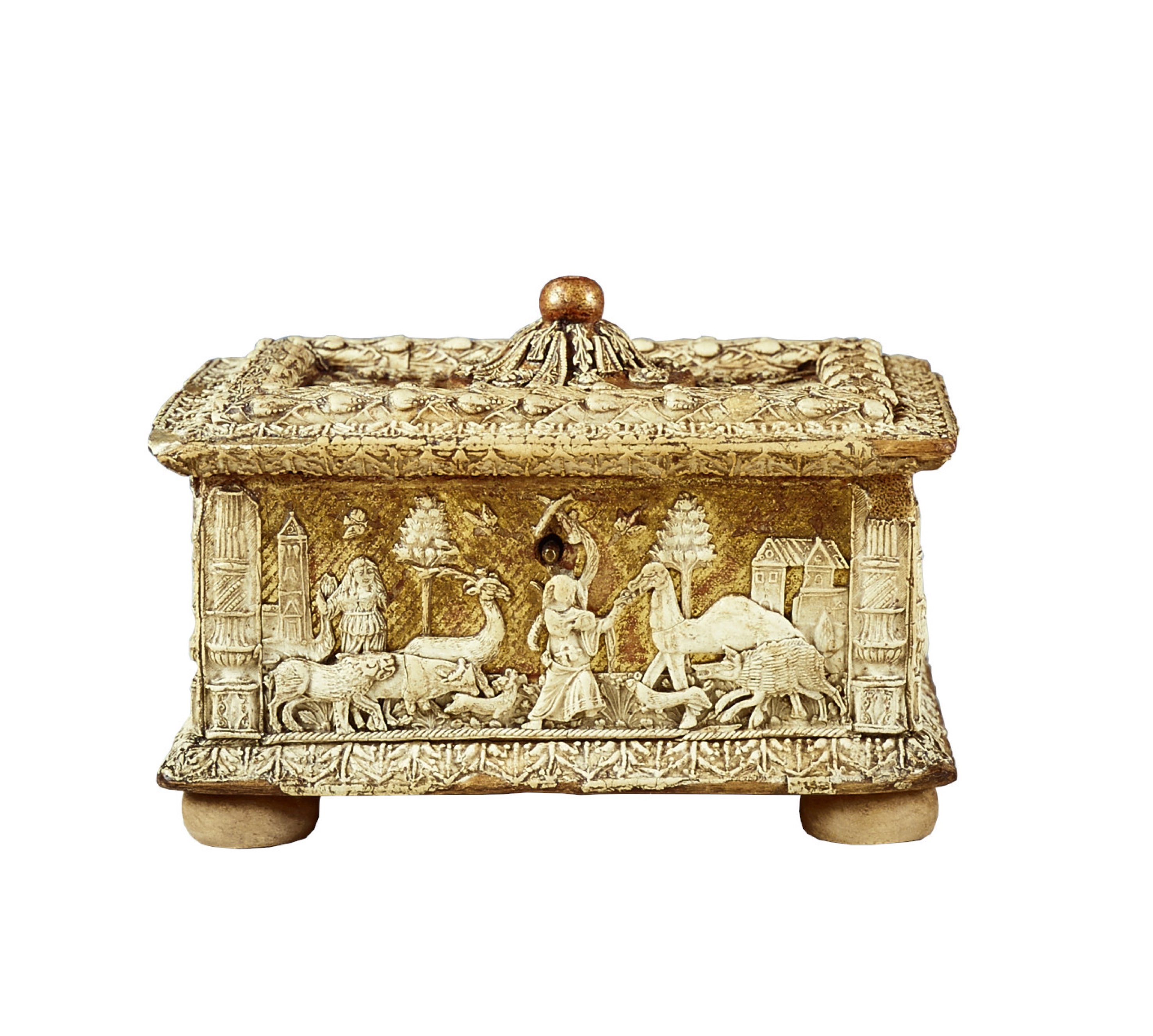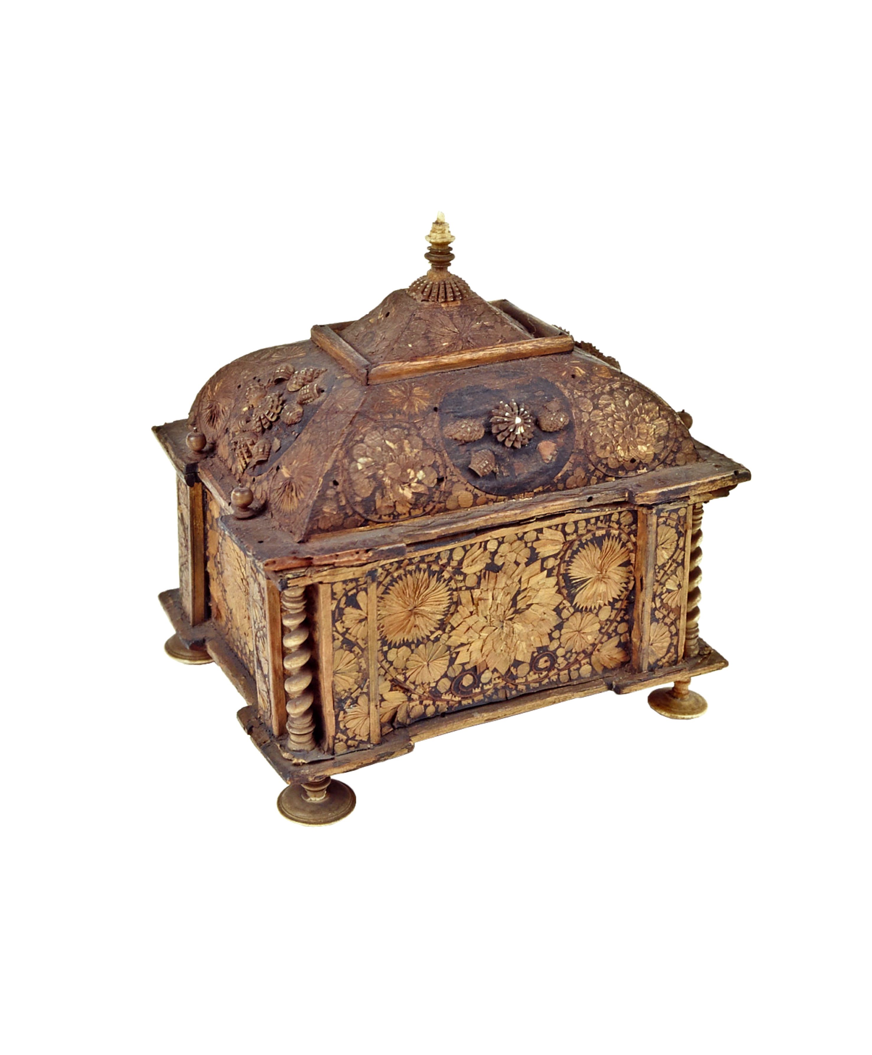 Il percorso espositivo si arricchisce di altri cofanetti preziosi e insoliti che ornano la Camera delle Meraviglie, come quello in legno e avorio con elementi decorativi vegetali e spiraliformi, probabilmente adoperato in ambito liturgico e databile alla metà del XVII secolo, rivestito all’interno con carta rossa decorata con motivi vegetali e animali impressi in oro. S’incontrano poi la piccola cassettina in ebano e osso caratterizzata da una singolare decorazione a marqueterie, tipica di una produzione artigiana sviluppatasi nella seconda metà del XIV secolo nell’area centroitaliana, in particolare toscana; il forzierino in rame rivestito di smalti blu e bianchi con raffinati ornamenti oro, che rientra nel novero di oggetti riferiti alla produzione veneziana quattro-cinquecentesca; l’affascinante coppa composta da una conchiglia innestata su un sostegno in rame dorato, con base circolare e profilo inciso ad acquaforte, ricondotta dalla critica alla cultura orafa del Cinquecento e dei primi anni del secolo successivo; la rarissima maschera da giustizia in acciaio brunito, modellata con i lineamenti di un uomo calvo di mezza età, composta da due parti congiunte prodotte nel nord Europa – verosimilmente in Germania o in Inghilterra – in epoche differenti, e poi assemblate in un unico manufatto nel XIX secolo; e il cappello maschile in pelle scamosciata di manifattura italiana, databile alla metà del Cinquecento.