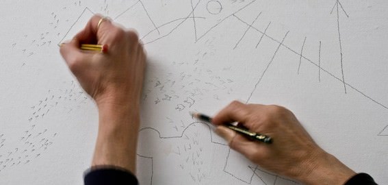 L’occasione: il 10 febbraio 2010 Marisa Albanese e Adele Prosdocimi esperimentano per la prima volta l’esecuzione congiunta di un lavoro pittorico sulle pareti di un ambiente milanese molto luminoso. Le due artiste chiedono a Nicolò Lombardi il suo sguardo sull’azione.