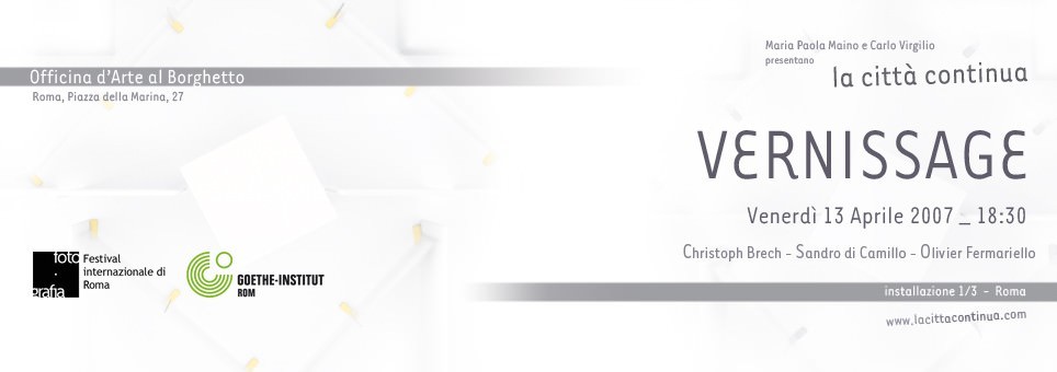 Primo episodio di una serie di tre installazioni che coinvolgono le città di Roma, Parigi e Berlino. Tre artisti – italiani, francesi e tedeschi – indagano sulla relazione che accomuna queste tre capitali europee. Le città ci appaiono diverse le une dalle altre anche se, in realtà, sono edificate tutte seguendo il medesimo schema: come i sogni, sono costruite di desideri e di paure, con regole assurde e prospettive ingannevoli. Ed ogni singolo spazio urbano è in sé una successione nel tempo di città diverse, avvolte l’una dentro l’altra, strette pigiate indistricabili.