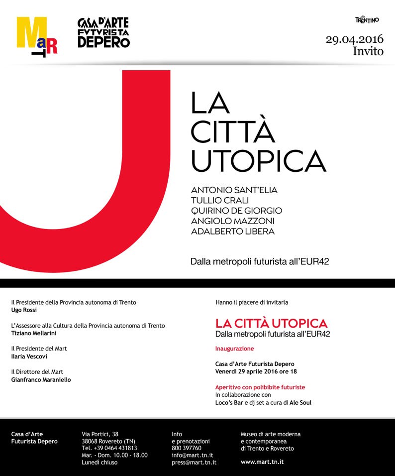 Nell’ambito delle celebrazioni per i 500 anni dalla pubblicazione del testo Utopia di Tommaso Moro, la mostra La città utopica. Dalla metropoli futurista all’EUR42, a cura di Nicoletta Boschiero, presenta alcuni disegni, progetti e documenti provenienti dalle Collezioni del Mart, dal Museo Civico Ala Ponzone di Cremona, dall’Ordine degli architetti, pianificatori, paesaggisti e conservatori di Bologna, Archivio Luigi Saccenti e dall’Archivio Quirino De Giorgio di Vigonza. Sono disegni di artisti e architetti che hanno rappresentato il tema della città come luogo privilegiato della modernità, del futuro, della velocità e del movimento