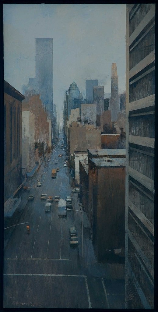 La veduta conclusiva è data da una veduta a volo d’uccello sui grattacieli americani, dove la tecnica dell’artista ha velato di una luce via le grandi costruzioni, non un freddo sky-line di cemento ed acciaio, ma una veduta che vibra per la vita che scorre al suo interno, pur senza essere direttamente visibile. Un artista spagnolo (Montó) che interpreta la grande lezione del maestro delle città vive: Antonio López García.