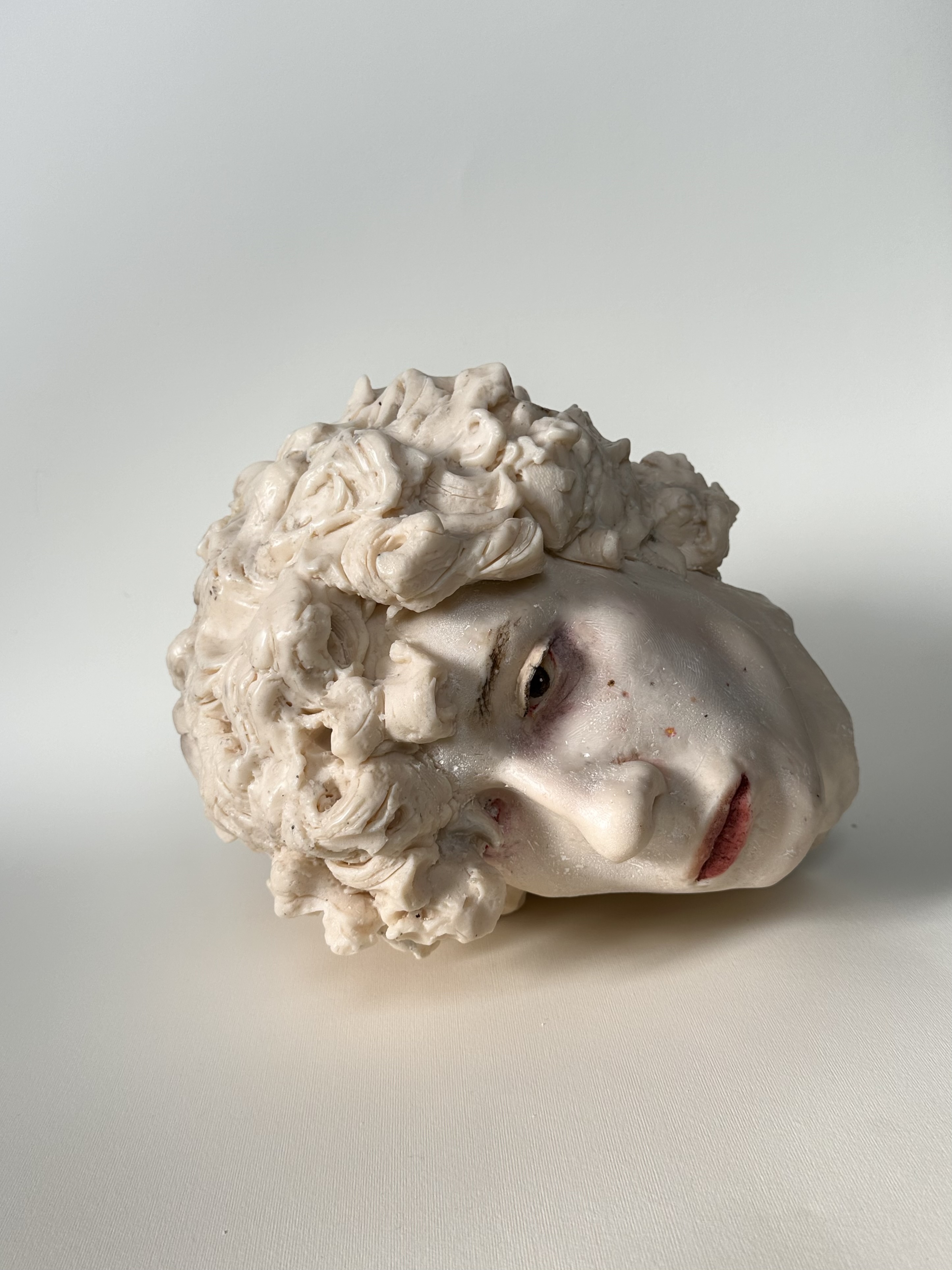 Di Nola incarna nelle sue opere il tormento di una ricerca continua del senso dell’esistenza. La tensione che le determina si riverbera sulla superficie di questi corpi spesso acefali, nei quali l’artista plasma la materia nel tentativo di dare forma simbolica all’anatomia, concentrandosi sulle parti ritenute più sensibili e vulnerabili. La sua carnalità livida è un allarme e una conferma della condizione psichica.
